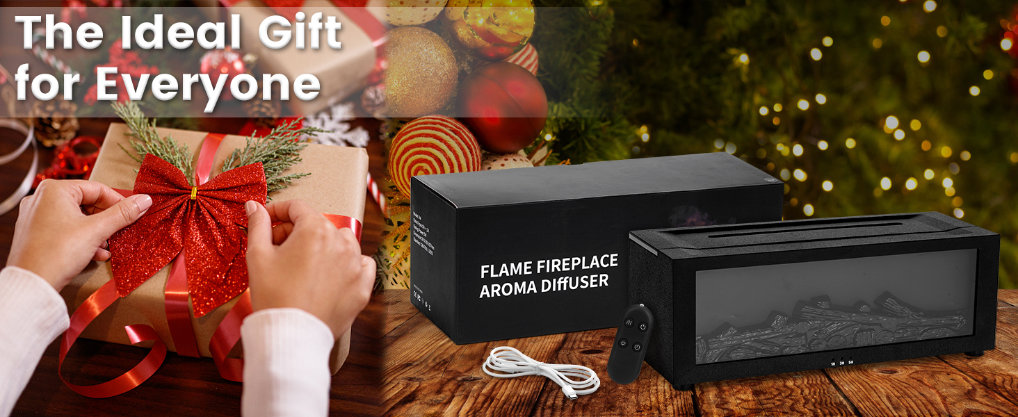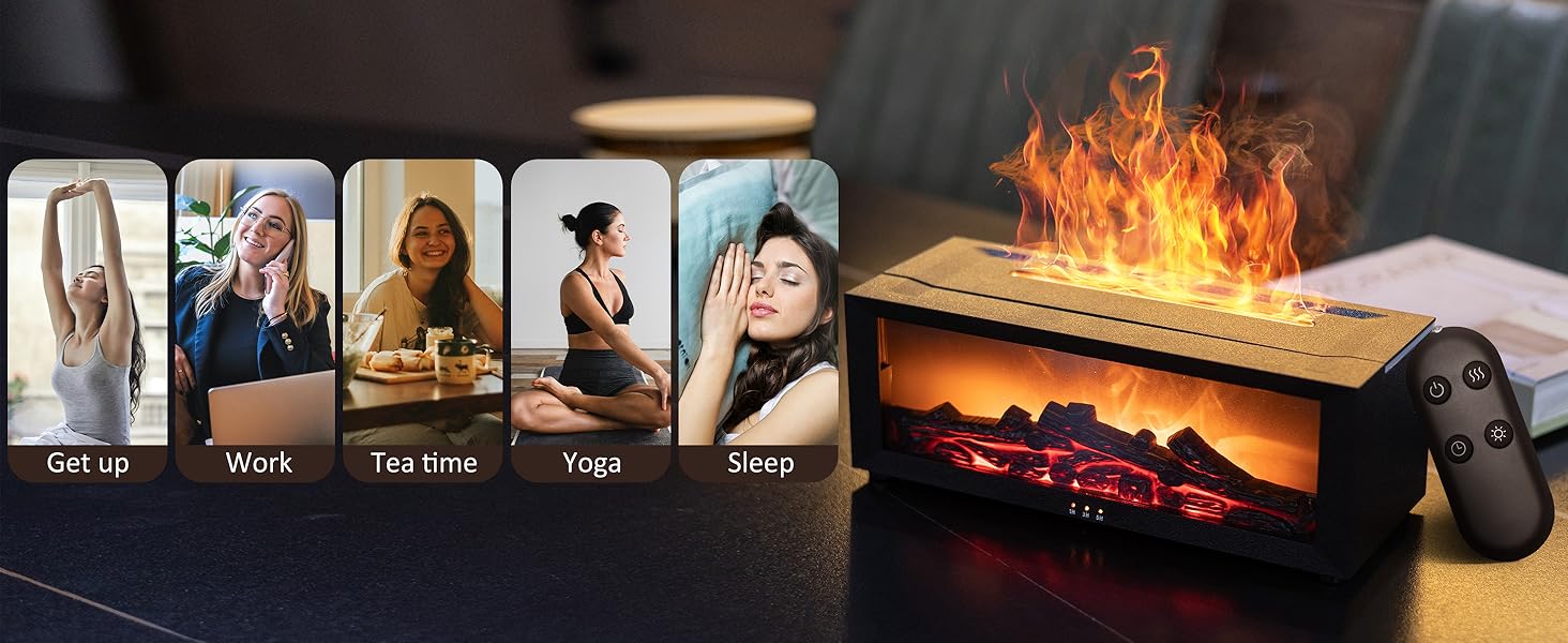Experience the cosy ambiance of a fireplace with calming aromatherapy. Our sleek black diffuser creates a realistic flame effect and fills your space with soothing scents. Discover tranquillity today.- Realistic Flame!