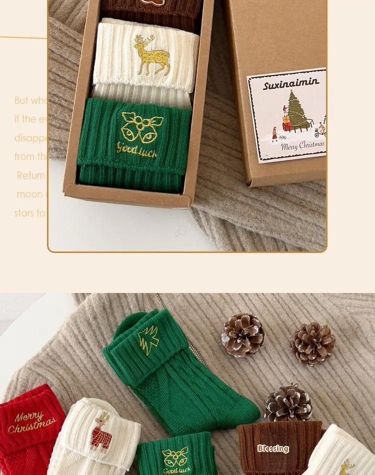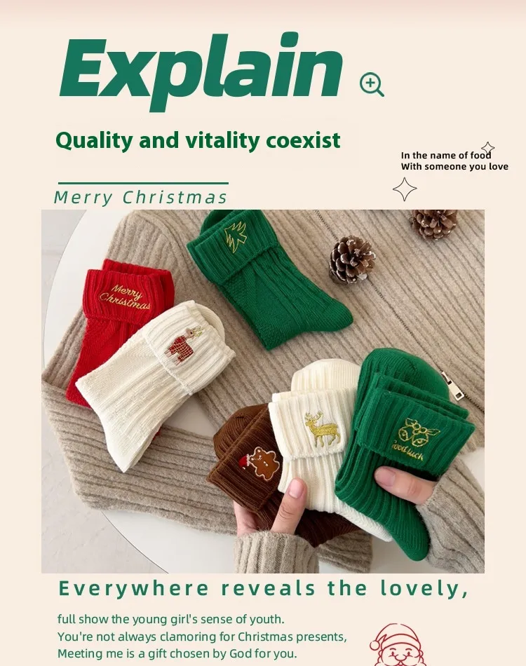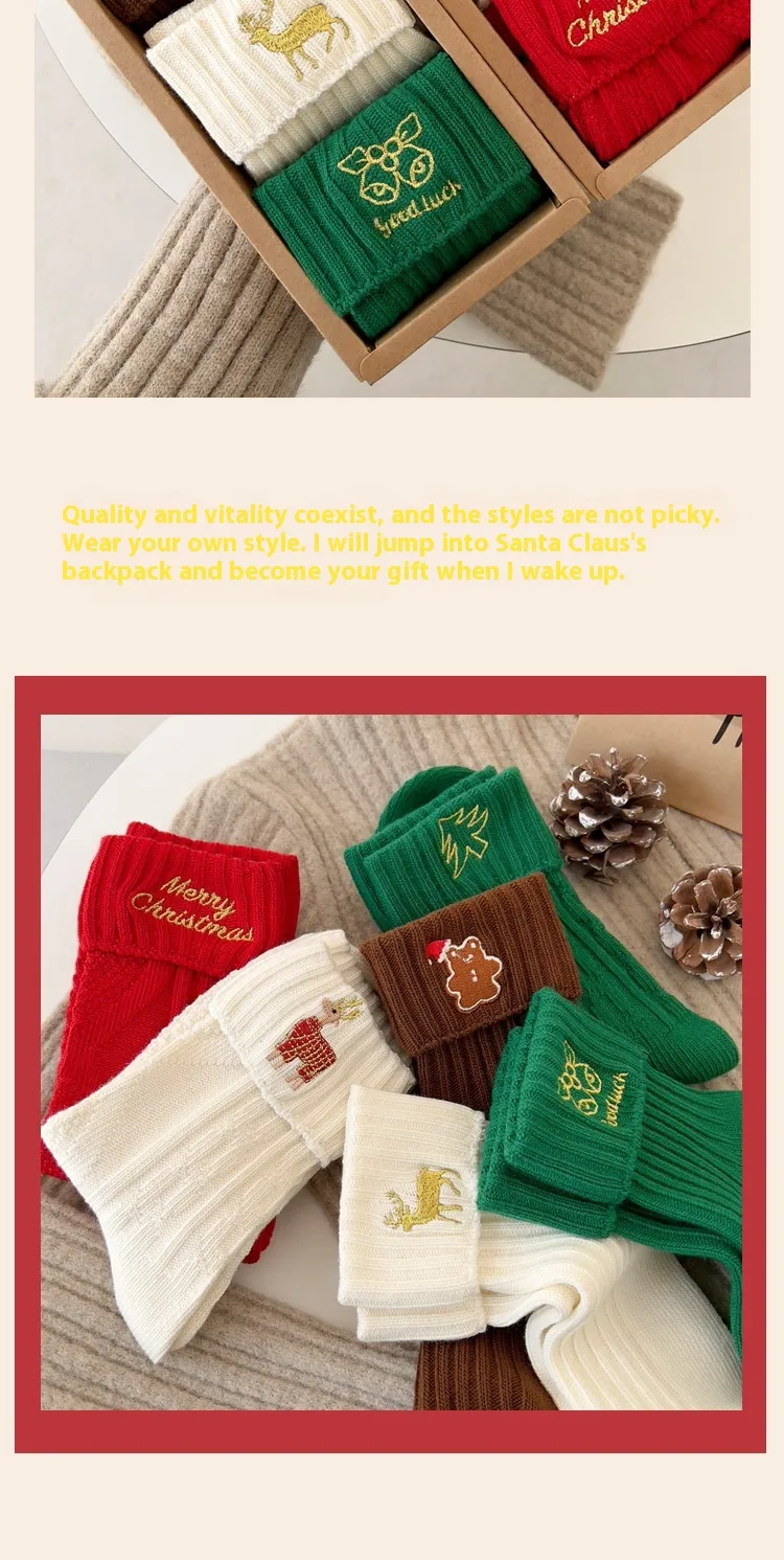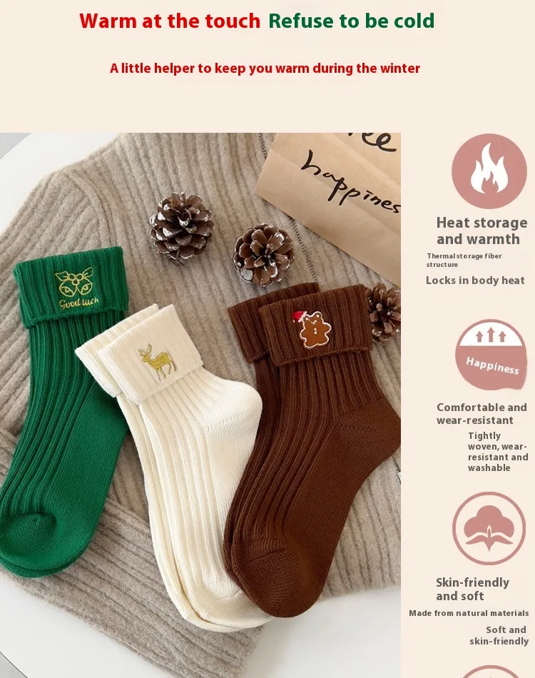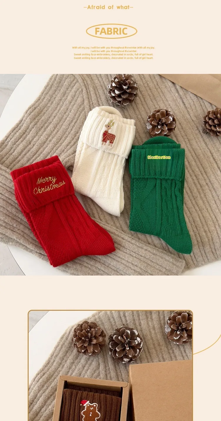Key Features of the Flanging Golden Embroidery Christmas Cartoon Letters Cotton Medium Stockings