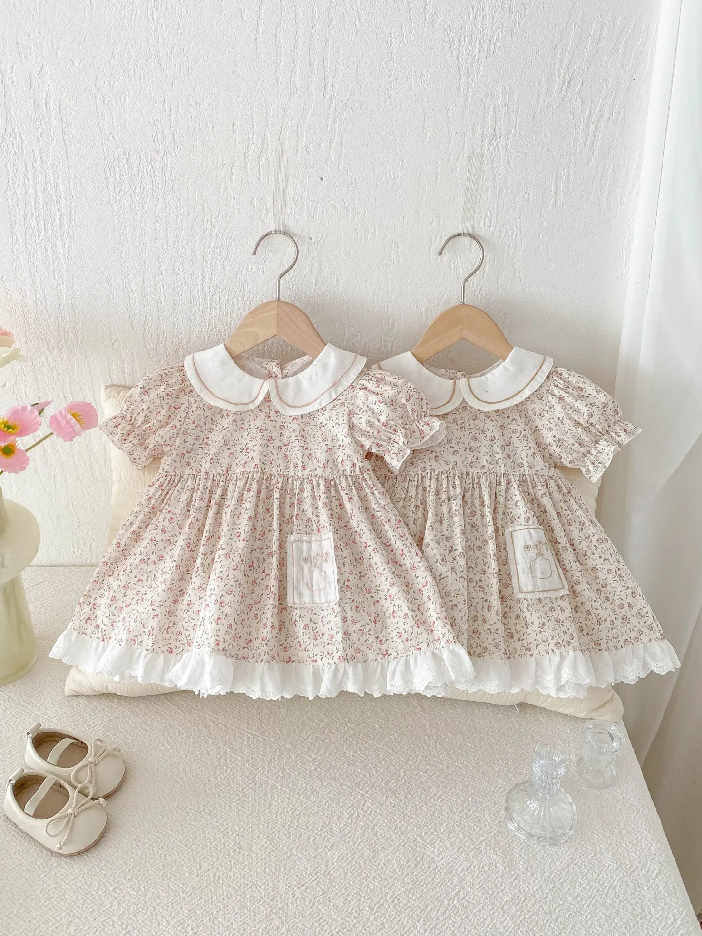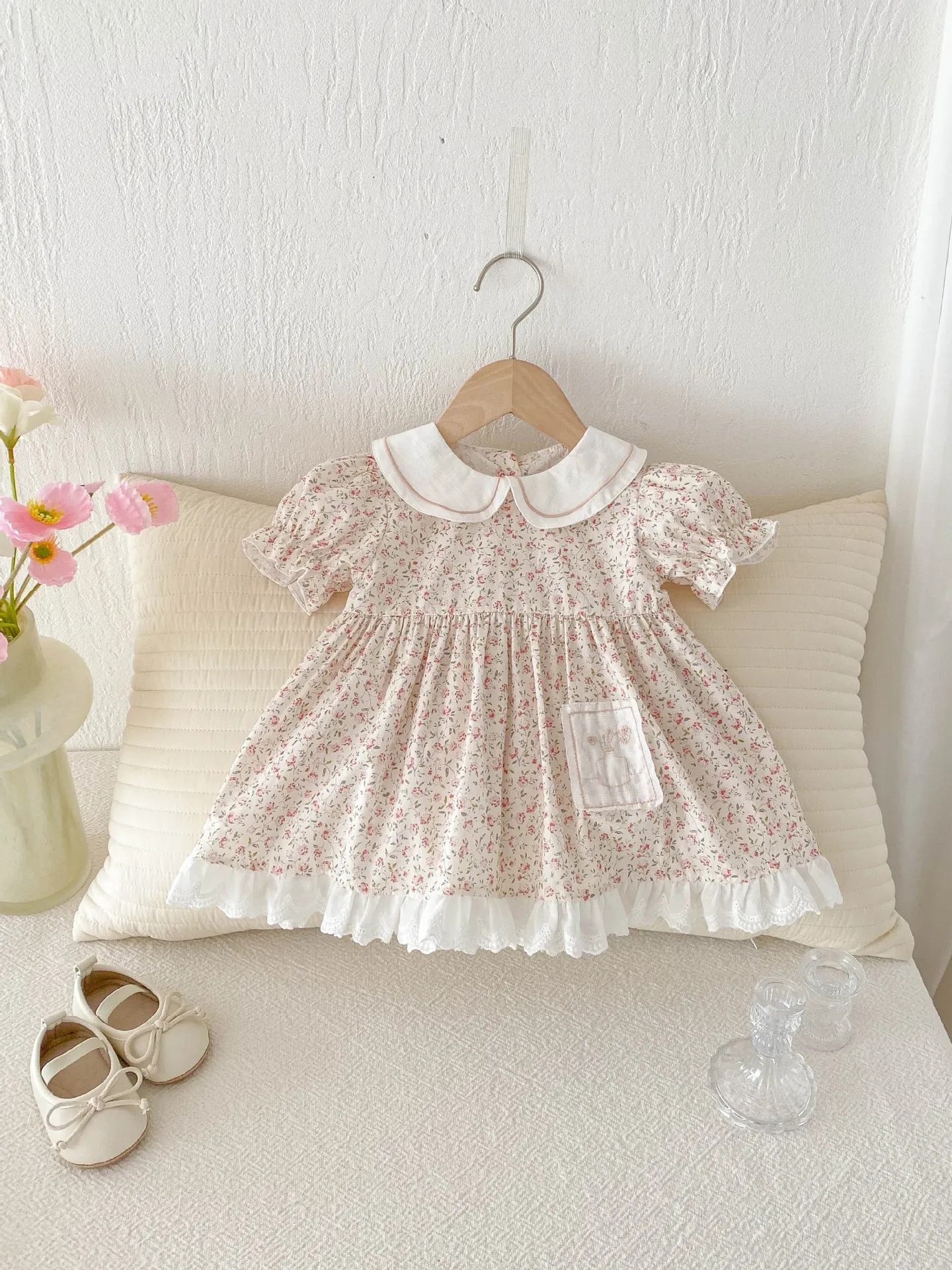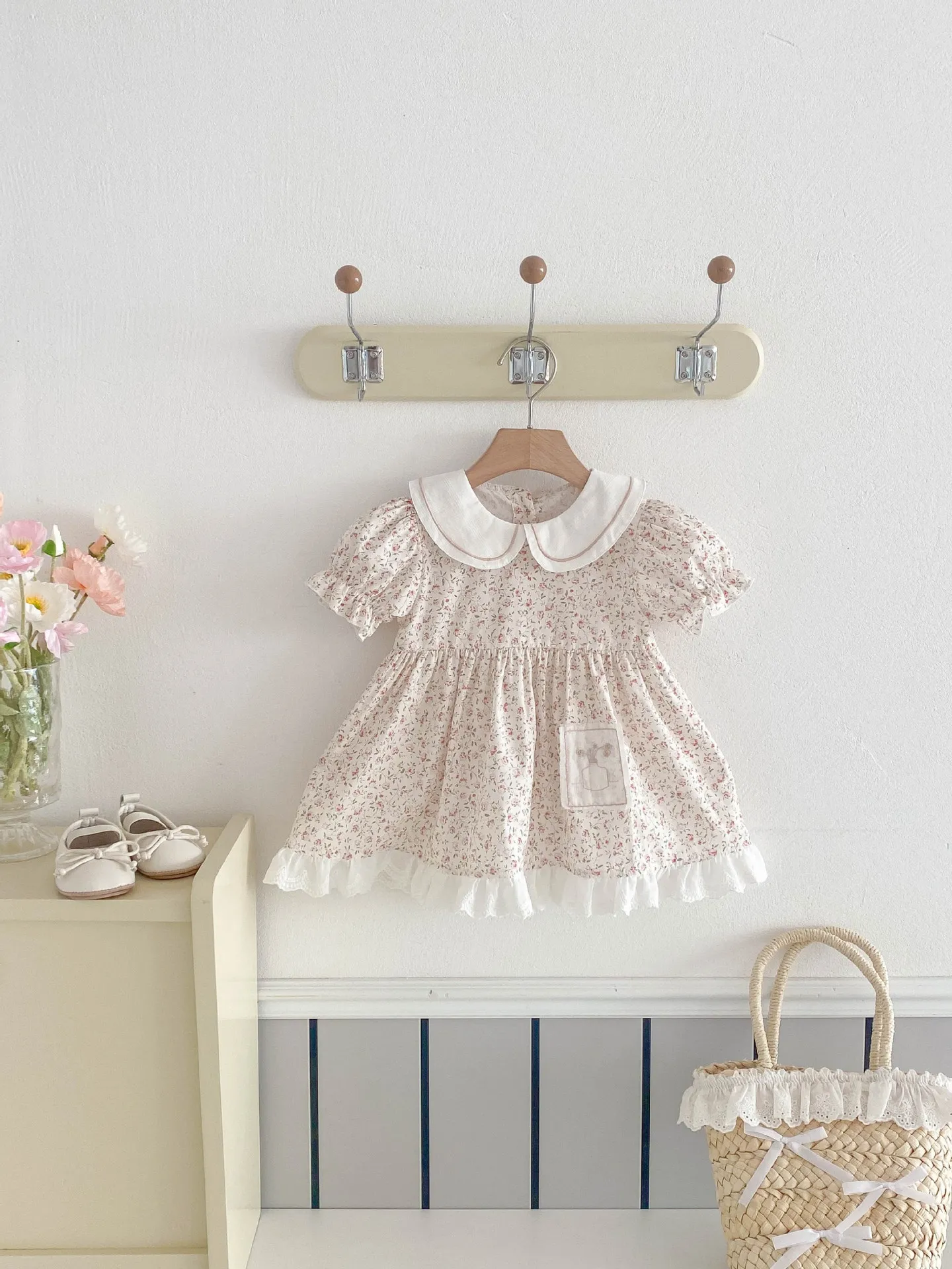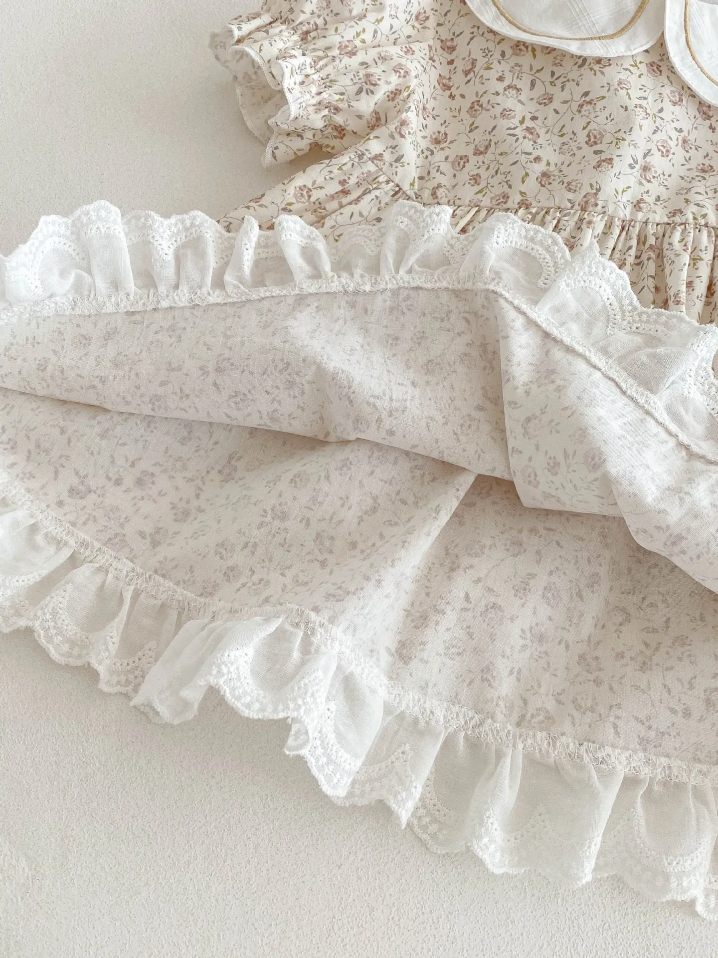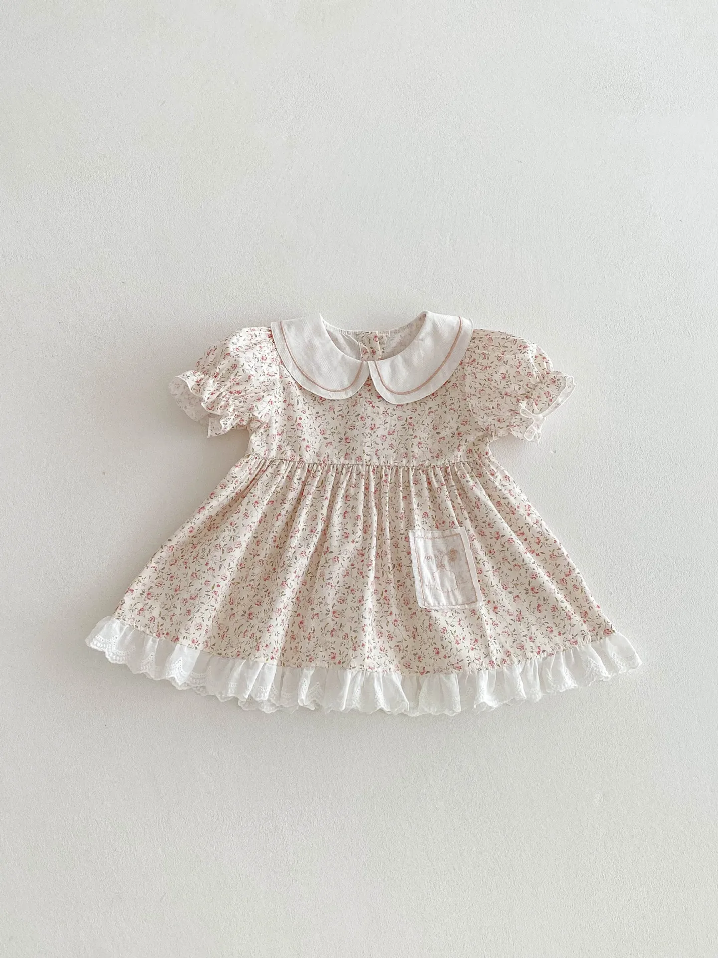 - Design: Floral print with lace, bow, or frill accents