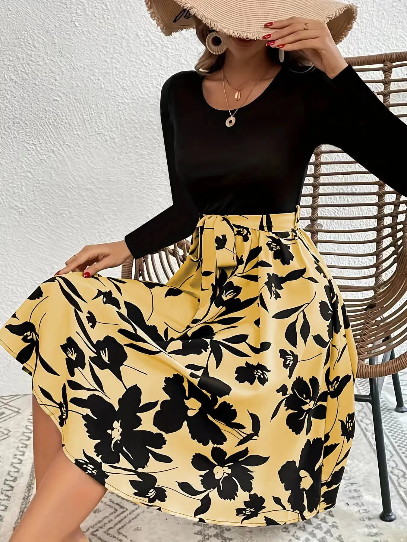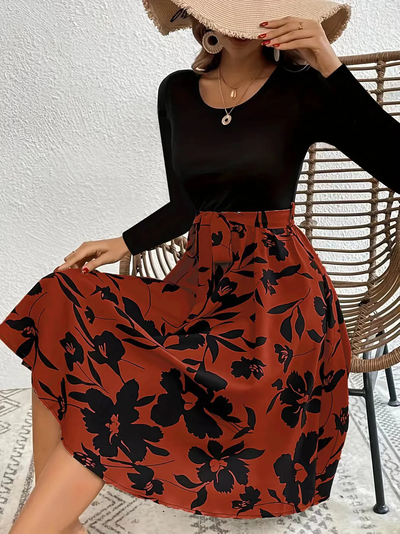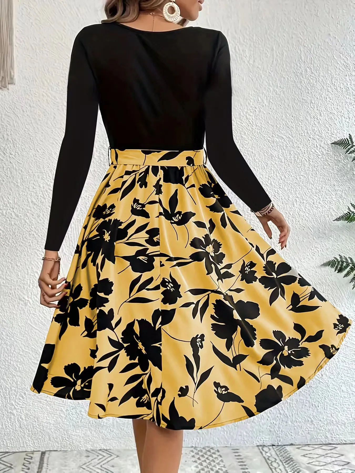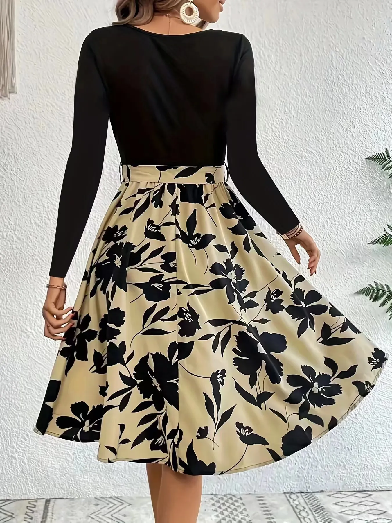 Floral Print Long Sleeve Dress Fashion Round Neck Tie Slim Dress Women's Clothing