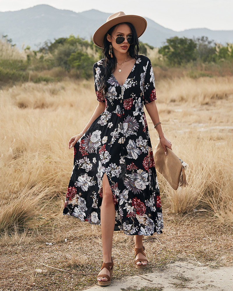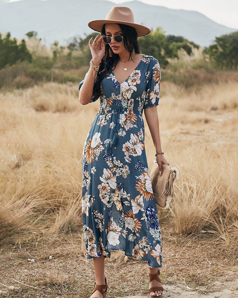 The Floral V-Neck Elastic Waist Summer Beach Dress features a flattering V-neckline that accentuates your collarbone and adds a touch of femininity. The beautiful floral print brings a burst of color and freshness, making it a standout piece for any summer occasion.