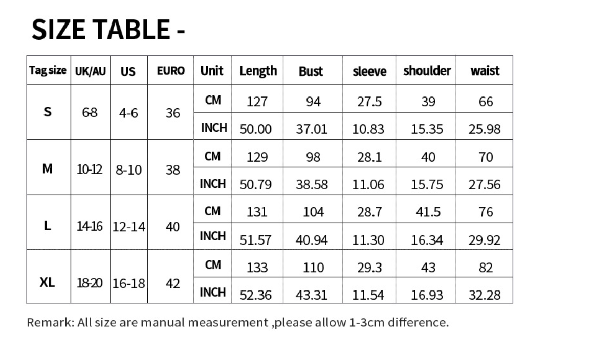 Available in various sizes, this dress is designed to suit different body types. The elastic waist provides a flexible fit, while the flowy skirt flatters all figures. Be sure to refer to the size chart to find your perfect fit.