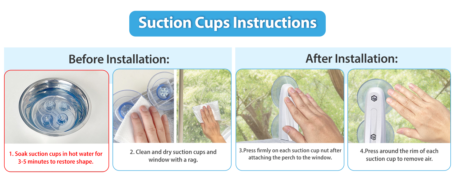 - Attention: Before installation, soak the suction cups in warm water (90°C) for 3-5 minutes, dry them thoroughly, clean the glass, and press firmly to remove any air for a secure hold.
