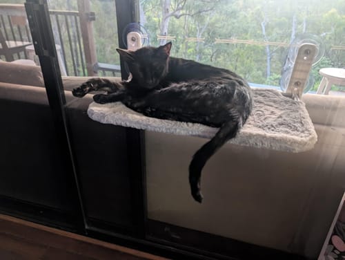 Ace loves his new hammock! This photo was taken within minutes of us installing it. Suction cups are very strong and I’ve not had to make