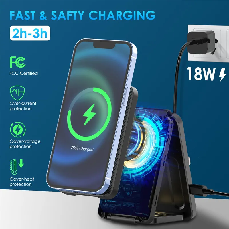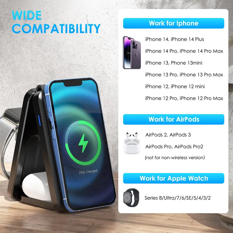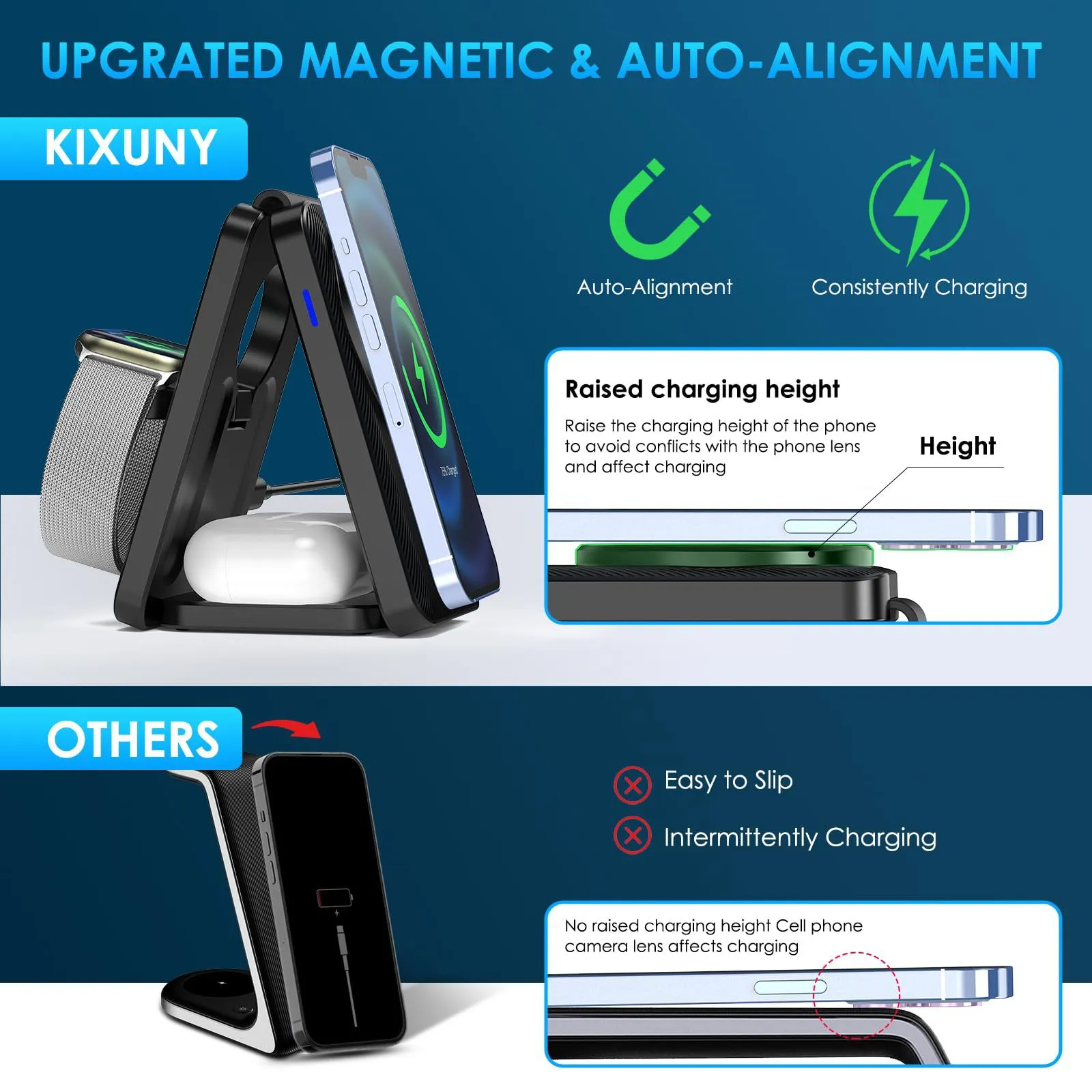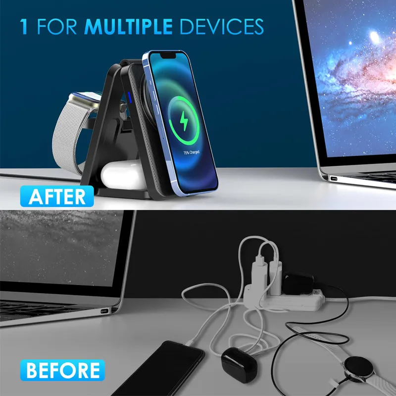 Perfect for those who appreciate modern technology, this versatile charger supports fast wireless charging and features a foldable design for easy storage and portability. Its magnetic alignment ensures that your devices are always in the perfect position for fast charging, making it ideal for anyone on the go.