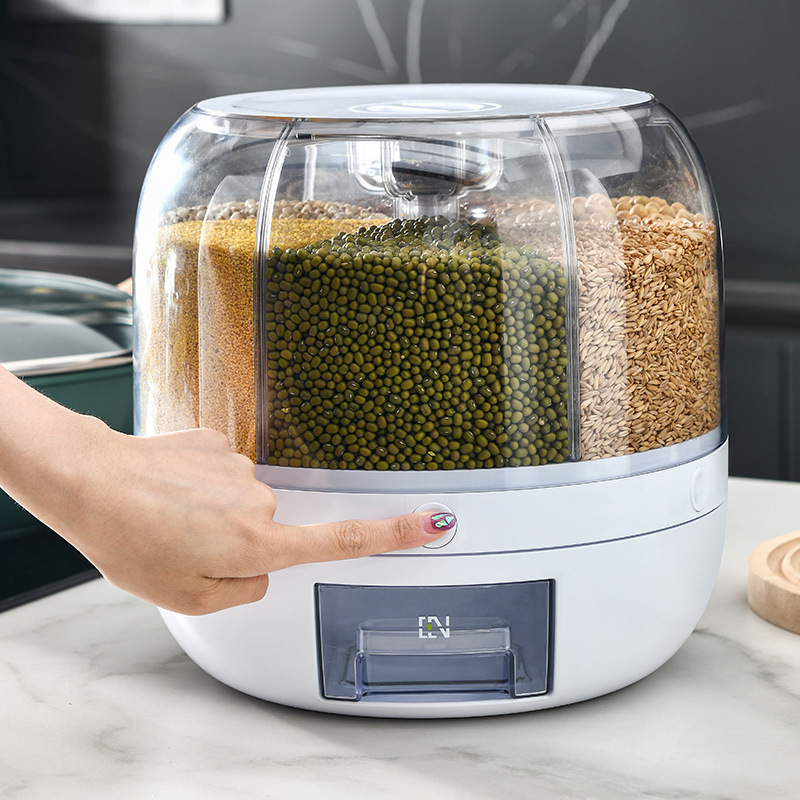 The container has 6 grids and can store whole grains, such as rice, green beans, red beans, barley, millet,