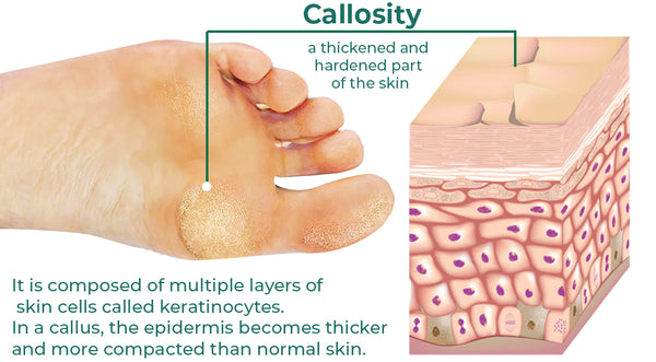 Repeated pressure or friction on particular parts of the foot leads to the development of calluses. The skin on the feet will thicken and stiffen in response to being rubbed or exposed to extreme force in order to defend itself. Uneven pressure distribution and calluses can also be brought on by abnormal foot mechanics, such as flat feet or high arches. Running or walking barefoot exposes the feet to unforgiving terrain, increasing friction and callus development.
