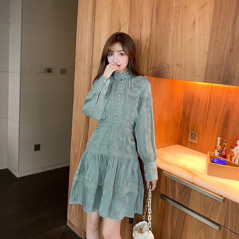 French Light Luxury Puff Sleeve High Waist Slim Midi Dress