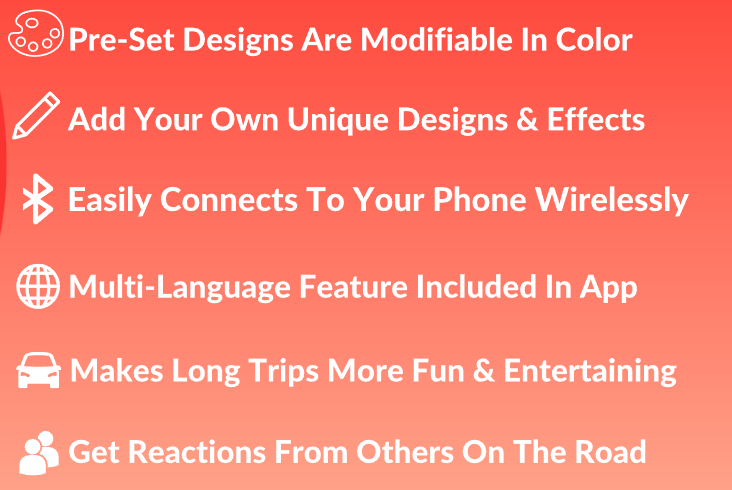 Our LED car signs are available in multiple languages, including English, Chinese, German, Spanish, Portuguese, Japanese, Korean, Russian, French, and Italian. They are perfect for a wide variety of occasions, such as holiday parties, weddings, camping trips, bars, hotels, stores, and of course, cars.