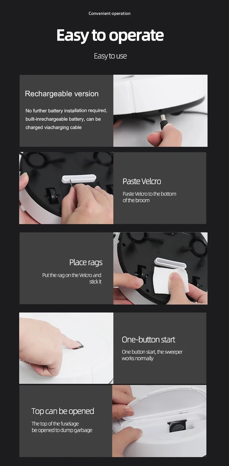 Rechargeable models of the sweeping robot, no need to add batteries in the back, only need to charge can be used normally, the first time you use the product if you can not work, please charge the work first, the power is full can be used normally!