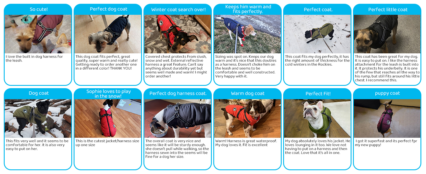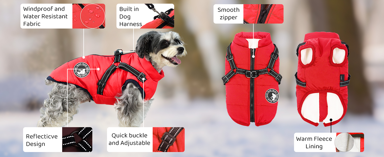 - ♥Dog Coat with Harness- Dog Coat and Dog Harness 2 IN 1 Design,as a coat, it have waterproof out layer and warm fleece inner,it keep your dog warm. as a dog harness, it is more confortable and safe than dog vest harness, the thick coat can protect your pet from hurt.no need to worry about your pet be strain by the harness.