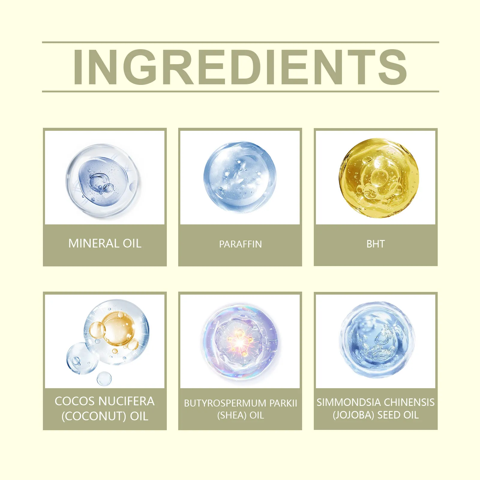 Ingredients: mineral oil, paraffin, butylene, coconut oil, shea butter, jojoba seed oil