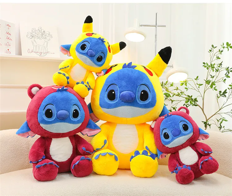 - Color and Material: The doll is crafted from high-quality, ultra-soft plush fabric in vibrant colors. The combination of Stitch’s blue and Pikachu’s yellow, along with the strawberry bear’s rosy accents, creates a visually striking and inviting plush toy.