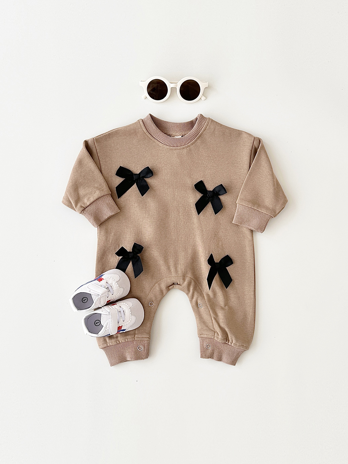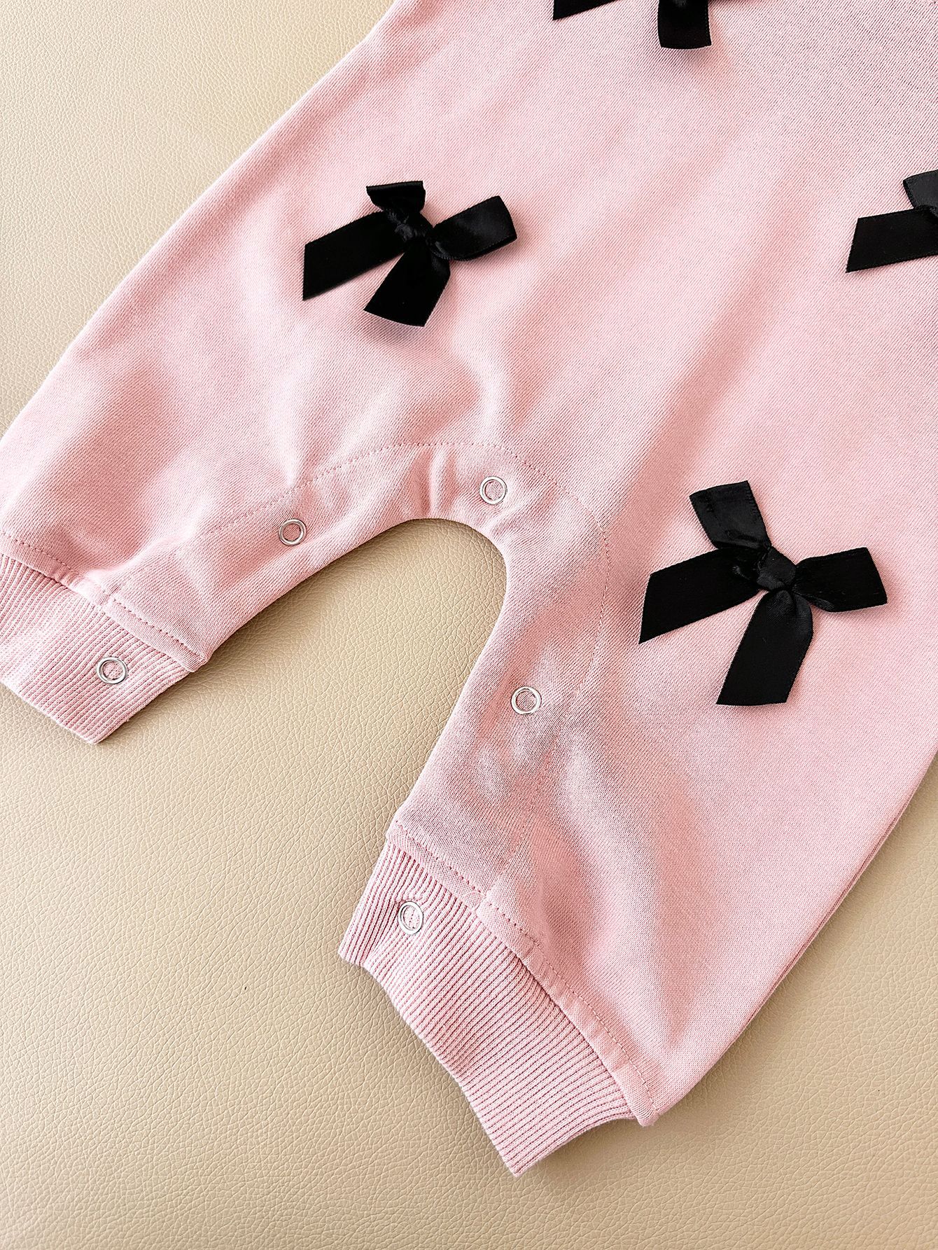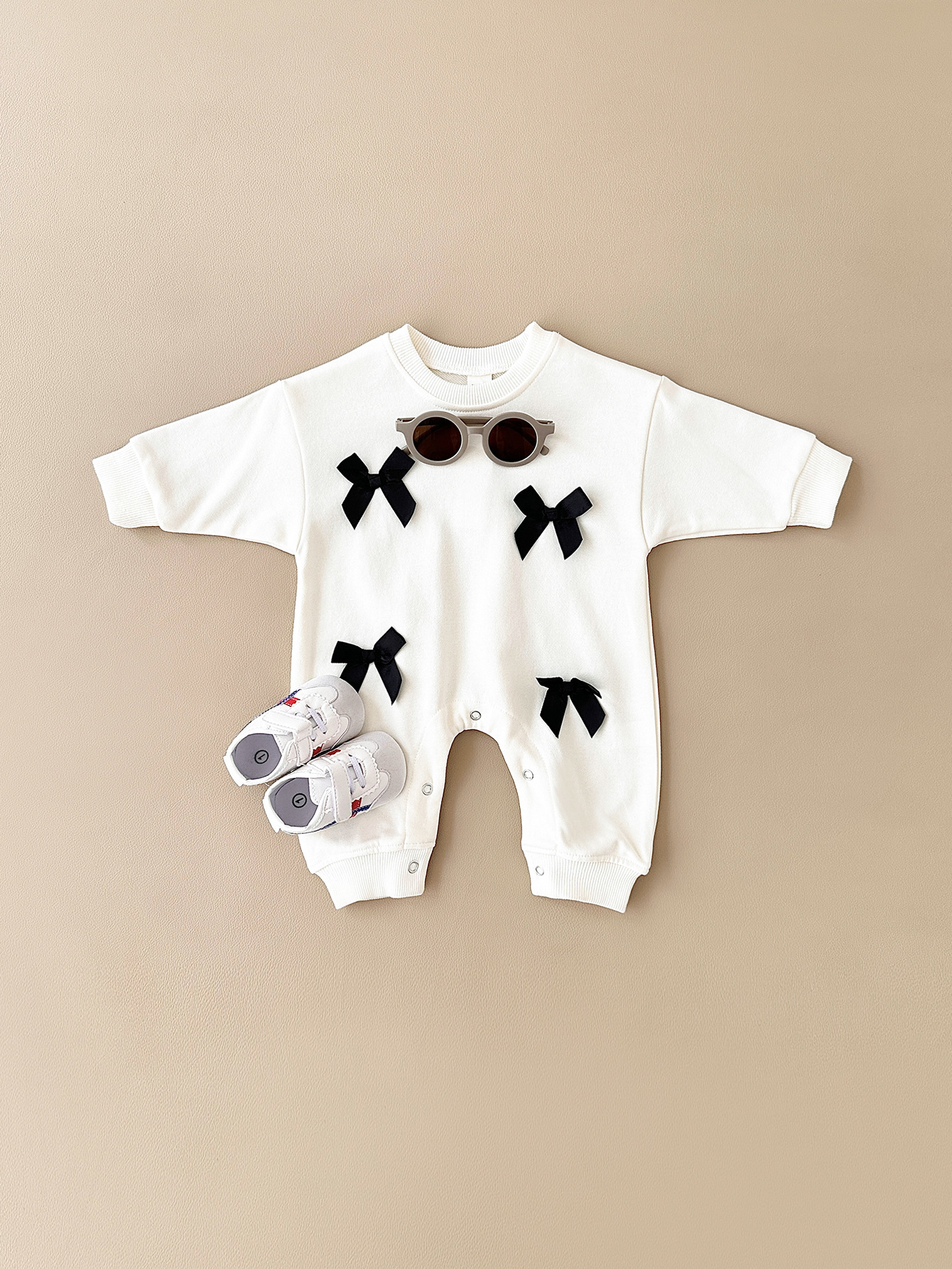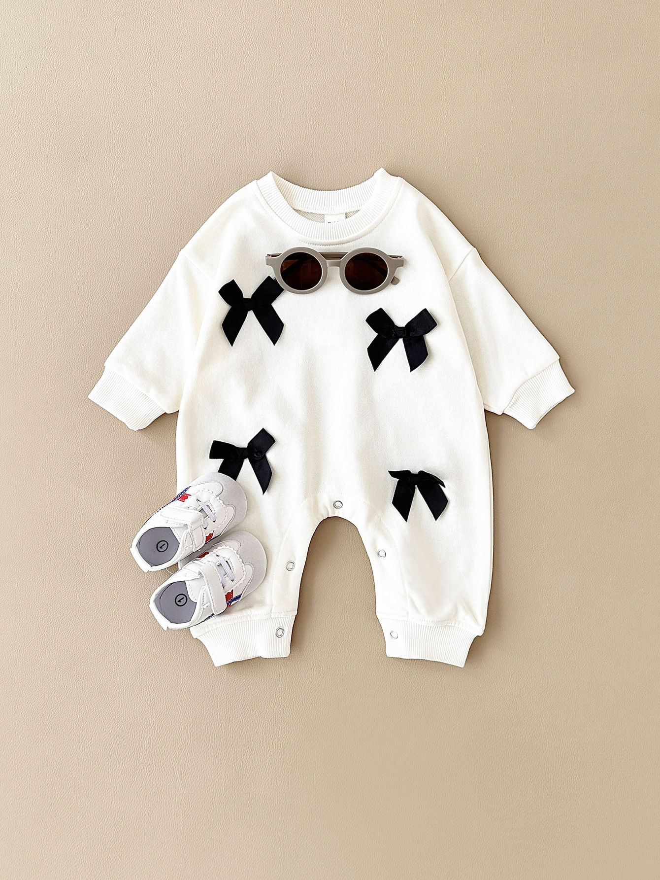 This jumpsuit features a charming bow accent on the front, adding a touch of playful elegance to the outfit. The round neck design is both