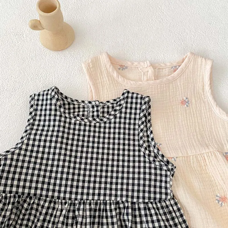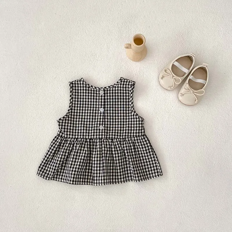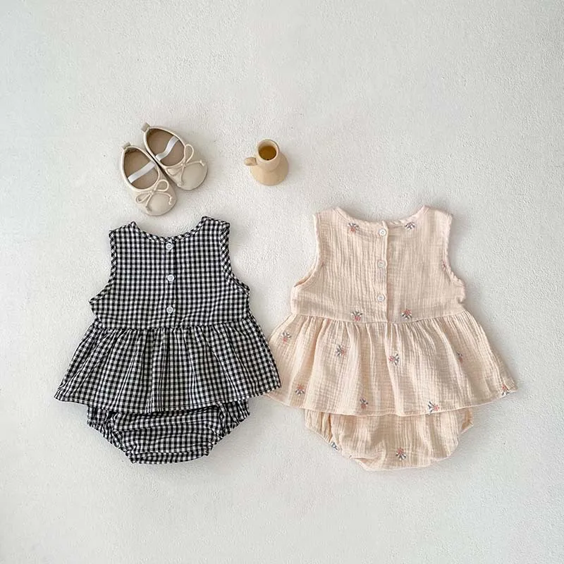 Girls' Plaid Embroidered Sleeveless Short Skirt Two-piece Set