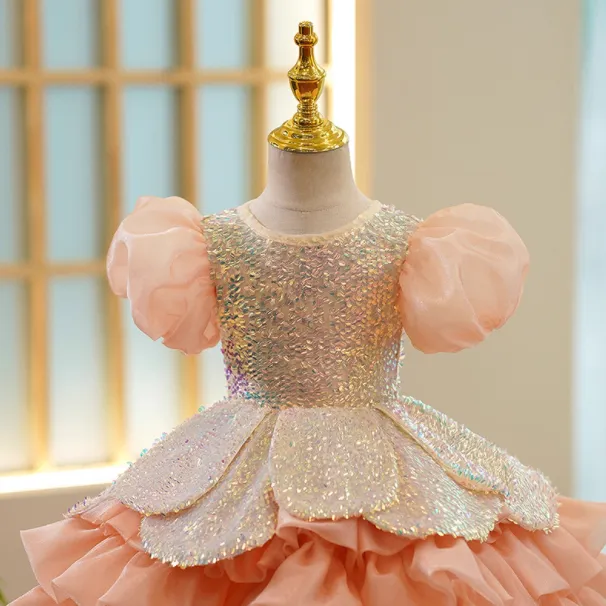 Make your little girl feel like royalty with the Girls Pure Color Sequins Puff Sleeve Princess Dress. Designed with shimmering sequins and charming puff sleeves, this princess dress adds sparkle and elegance to birthdays, parties, holidays, or special occasions.