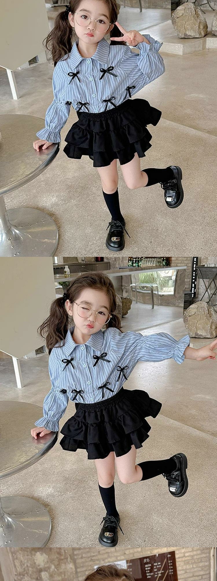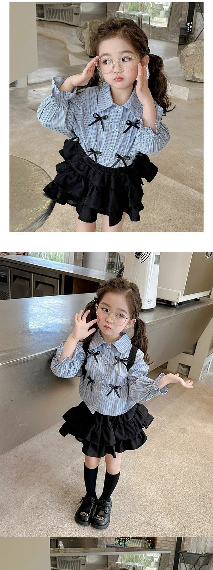 Color: black two-layer skirt blue striped butterfly shirt, blue striped butterfly shirt, black two-layer skirt