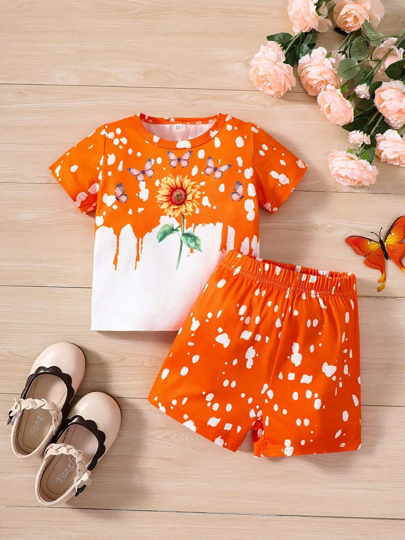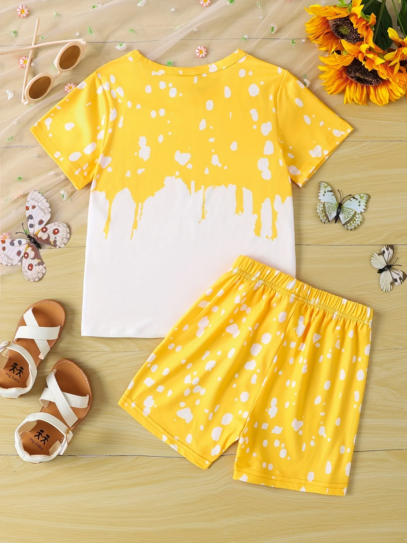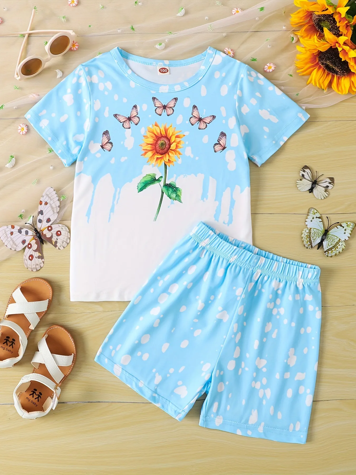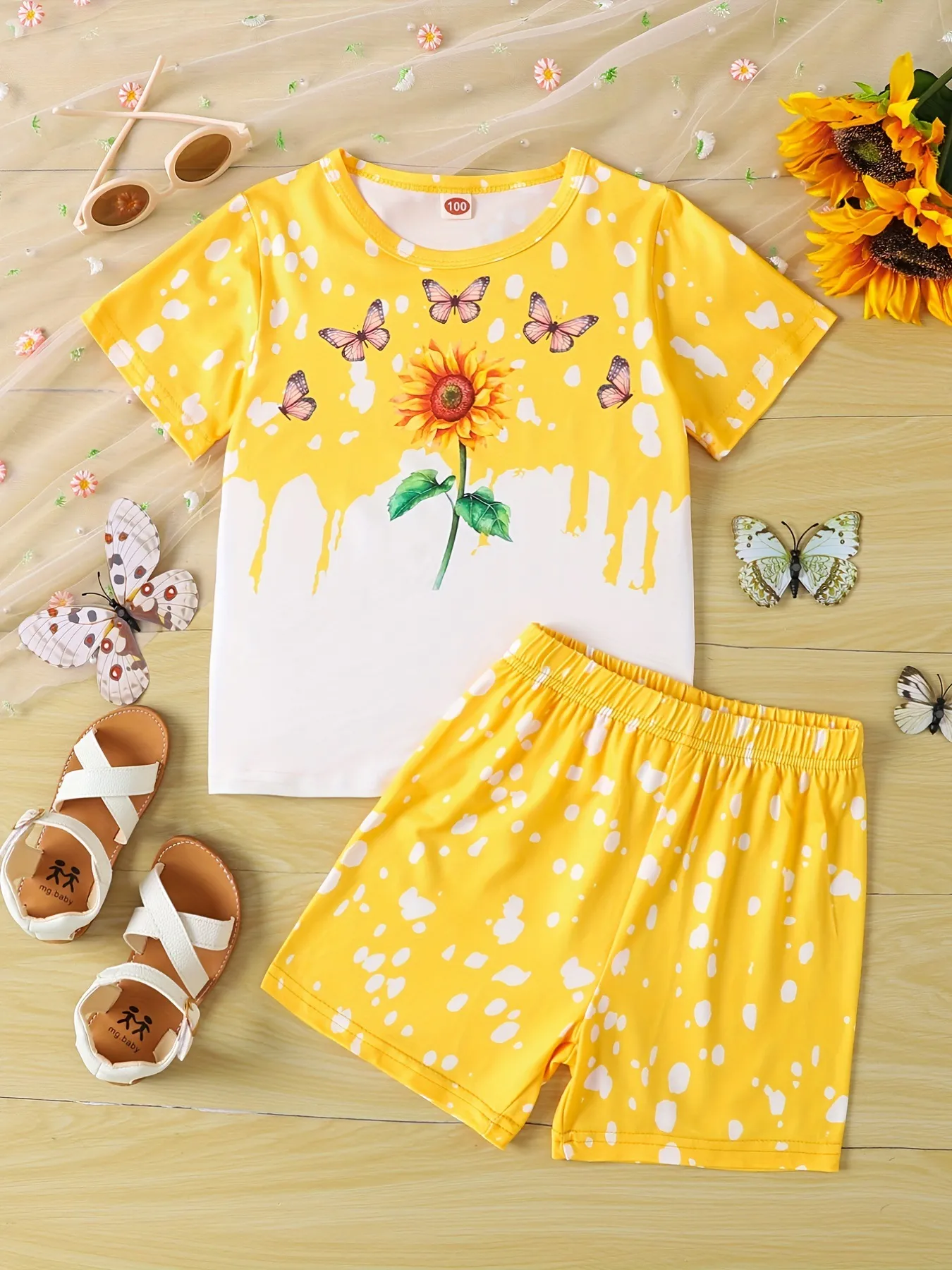 Girls Sunflower And Butterfly Pattern Short Sleeve Top Shorts Suit
