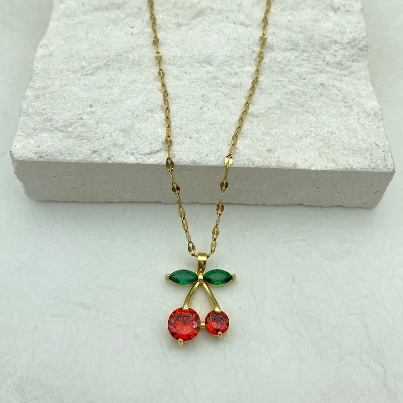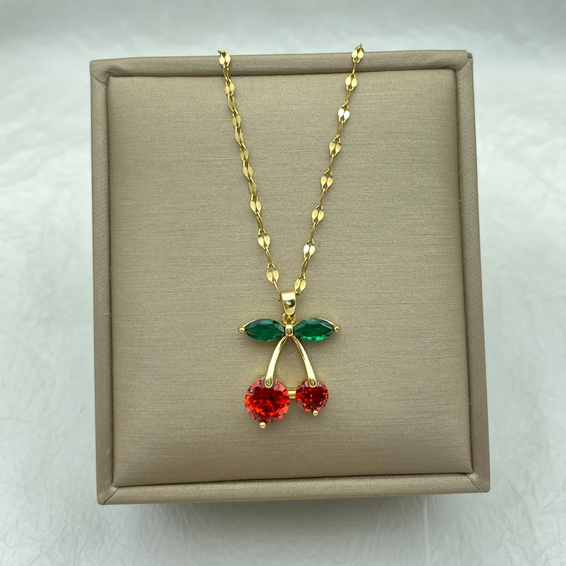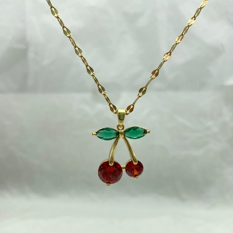 Crafted with high-quality gold-plated stainless steel, this cherry pendant necklace is not just a beautiful accessory but also a durable and long-lasting addition to your jewelry collection. The red cherry pendant, sparkling with zircons, brings a playful and fresh vibe, making it a must-have for trendsetters and fashion enthusiasts.