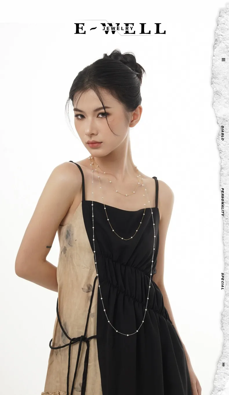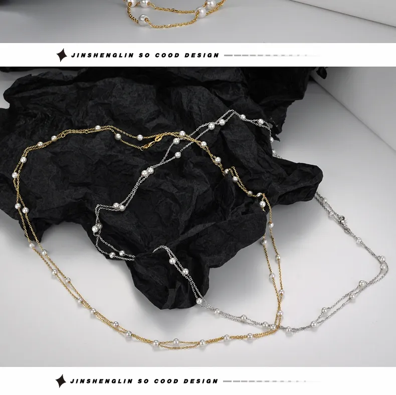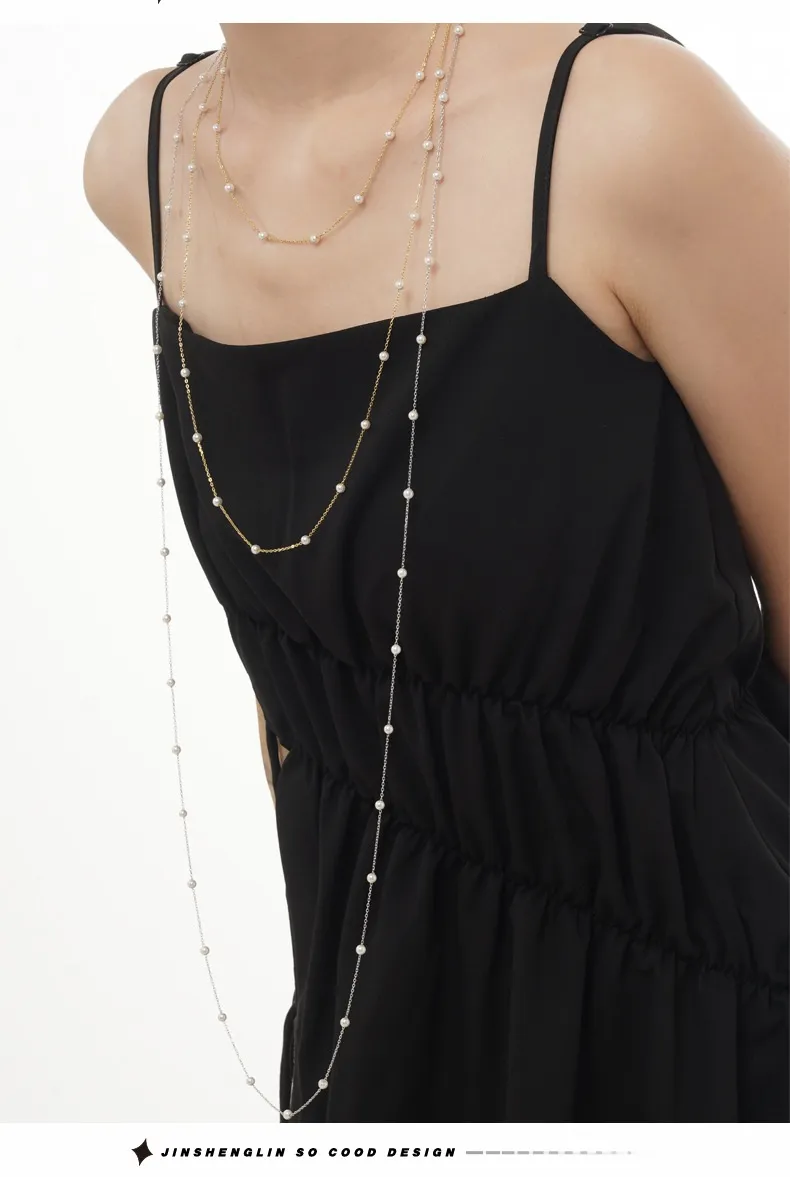 Handmade S925 Sterling Silver Shell Pearls Necklace Twin Beads Sweater Chain