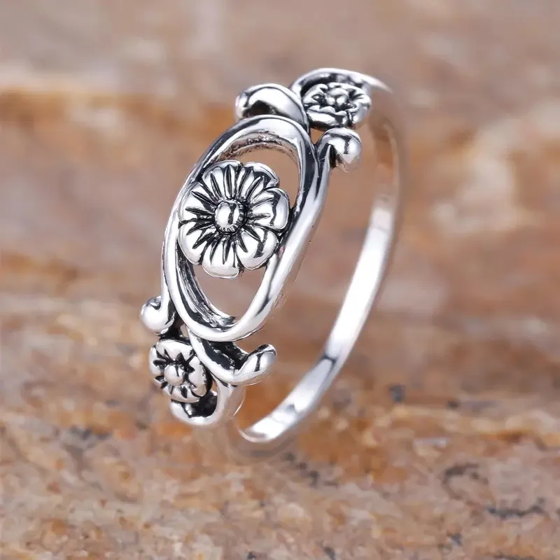 The retro floral design makes this ring a versatile accessory that complements casual, formal, and even bohemian styles.