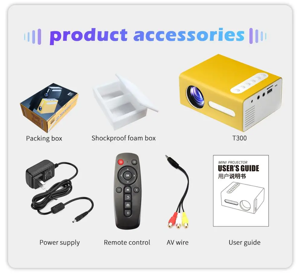 Enjoy a cinematic experience from your couch or deliver presentations without bulky equipment. The T300 HD Mini Projector is your go-to portable display solution — all in one sleek, pocket-sized design.