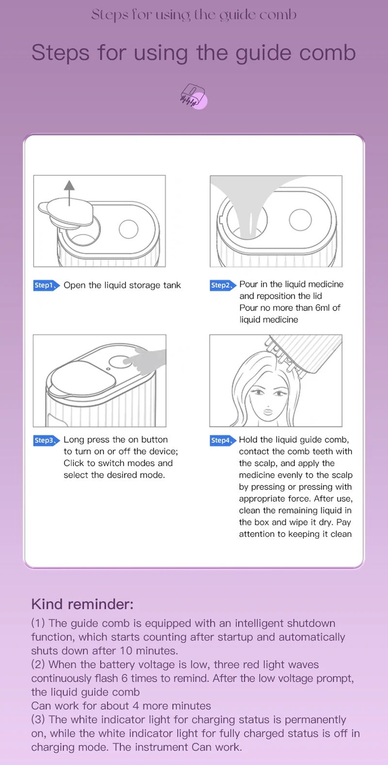 3. Three hair care modes (hair growth mode, massage mode, rejuvenation mode) effectively massage and relax the scalp, maintain hair,