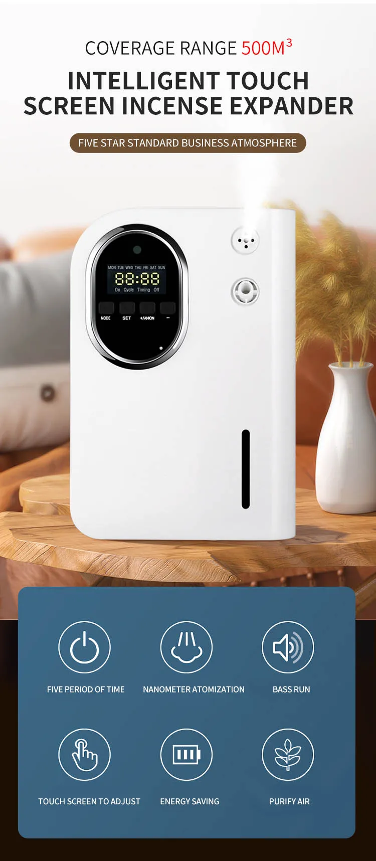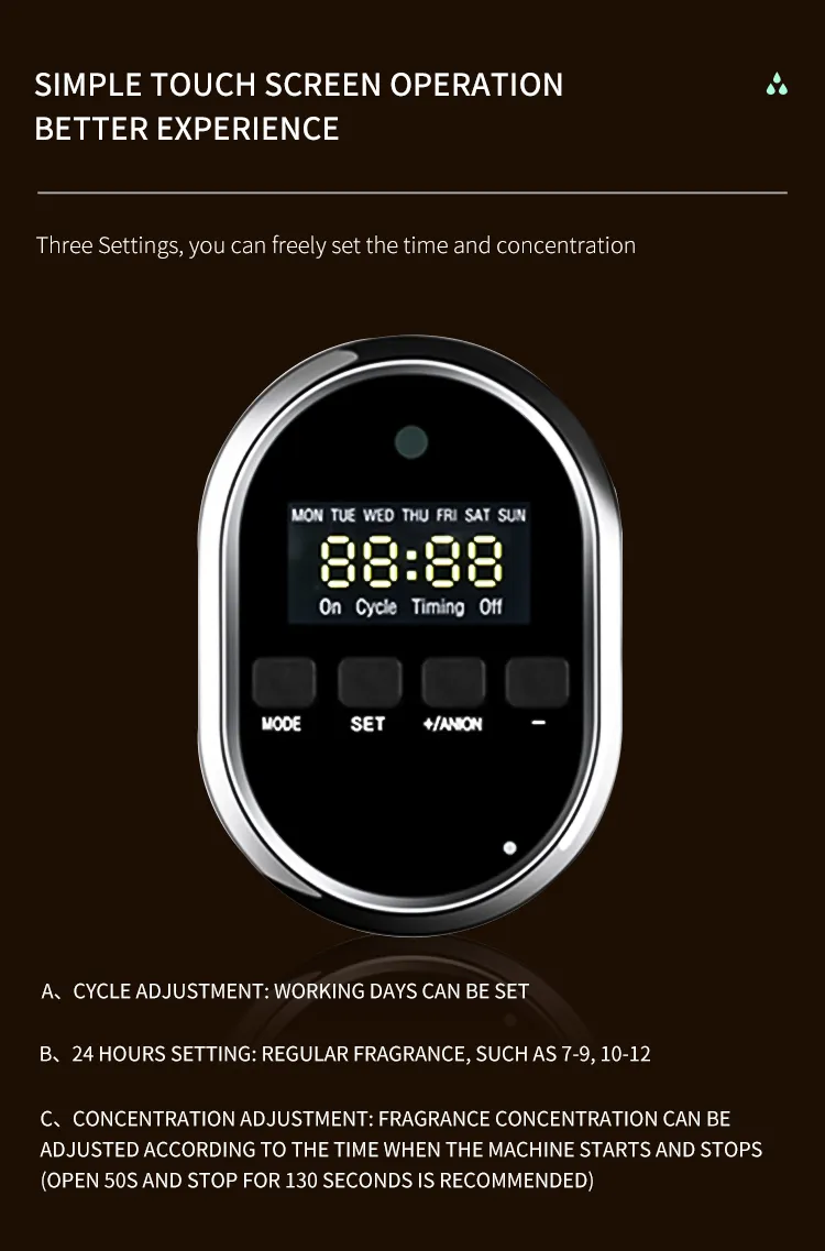- Continuous Diffusion: Provides continuous scent diffusion for hours, perfect for businesses and commercial spaces.