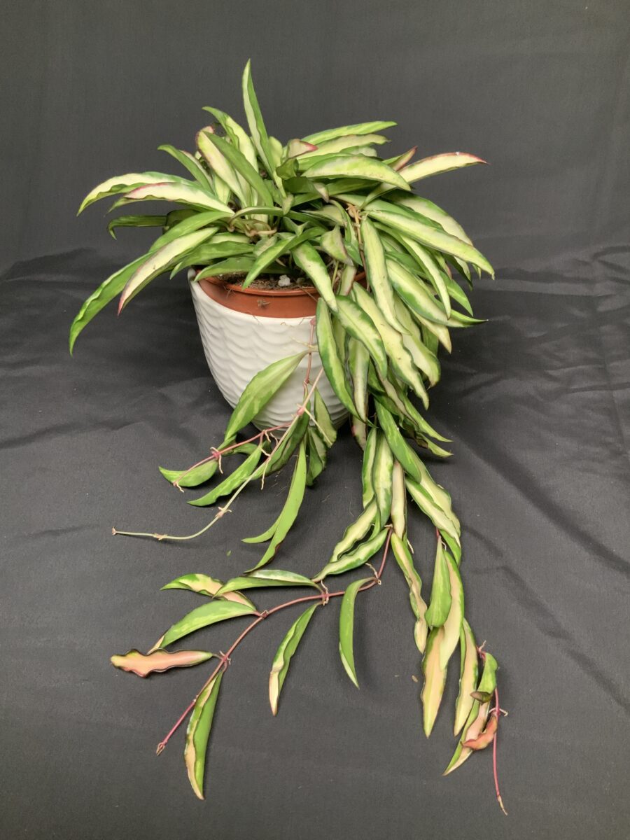 Hoya kentiana 'Tricolor' is a captivating and visually striking houseplant that is cherished by plant enthusiasts for its unique and colorful foliage. This exceptional variety of Hoya, also known as the wax plant, features long, narrow leaves that are beautifully variegated in shades of green, creamy white, and pink. The leaves have a glossy, waxy texture, adding to the plant's overall allure and making it a standout addition to any indoor plant collection.