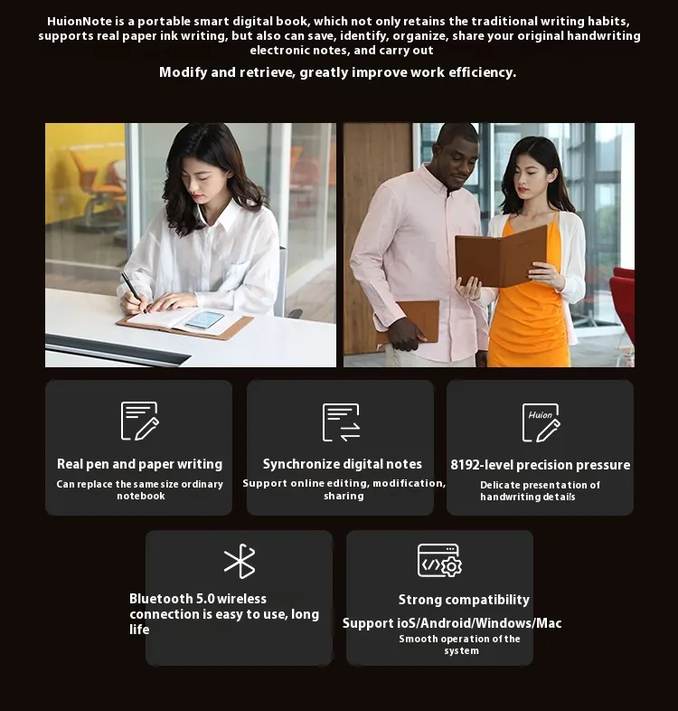 This smart digital notebook is perfect for those who value efficiency, organization, and seamless integration into their digital workspace. Whether you're in business meetings, brainstorming sessions, or lecture halls, the Huion Note X10 transforms your handwriting into editable digital text in real time.