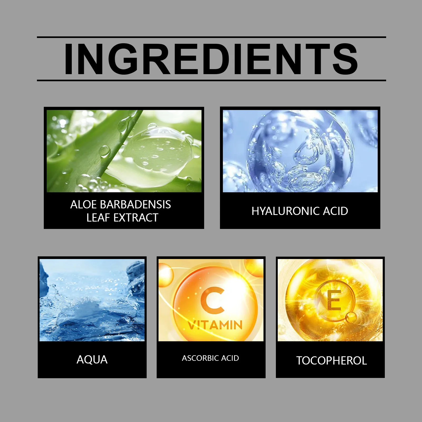 Ingredients: Water, hyaluronic acid, aloe leaf extract, vitamin C (ascorbic acid), vitamin E (tocopherol)