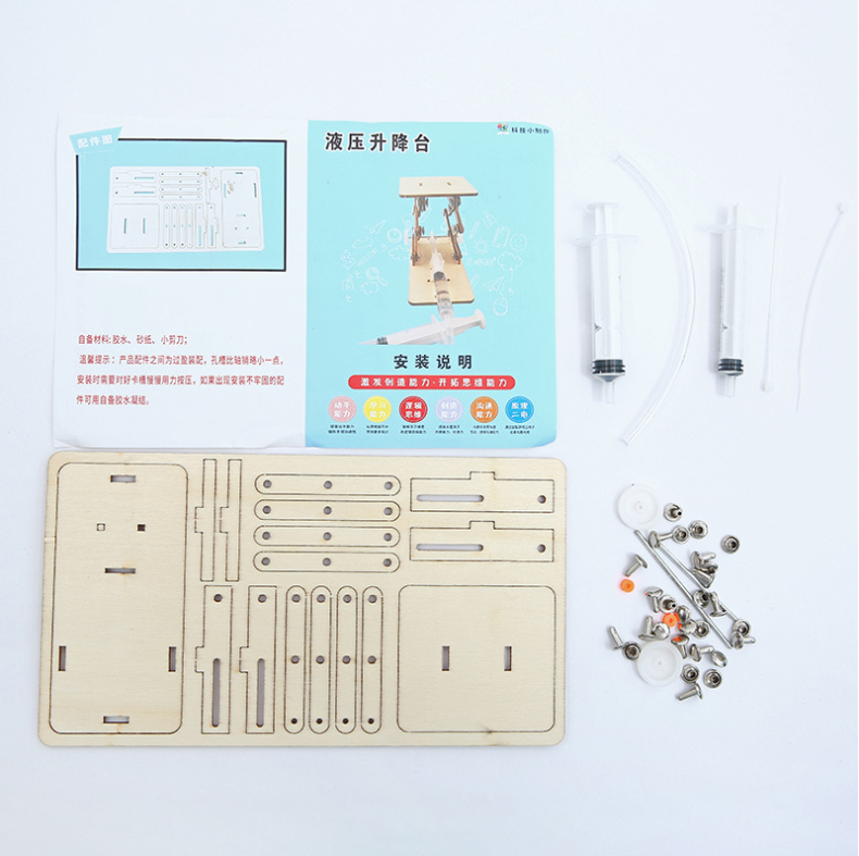 syringe is pushed, the water is pushed into the syringe with a hole, thereby driving the bracket to rise, which becomes a hydraulic lifting