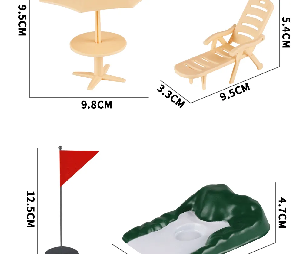 Accessories: a set of mini beach tables and chairs (two chairs, one table with an umbrella) in a bag, six golf pole heads, one set of hole flags, 12 foam white balls and two yellow plastic balls in a bag, two dune models, one river accessory, carpet 60x40CM, foot 25x15cm, one black handle, and a golf pole in a bag.