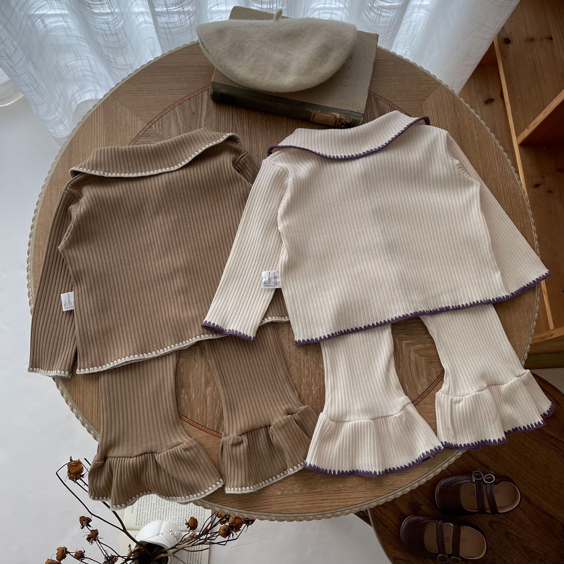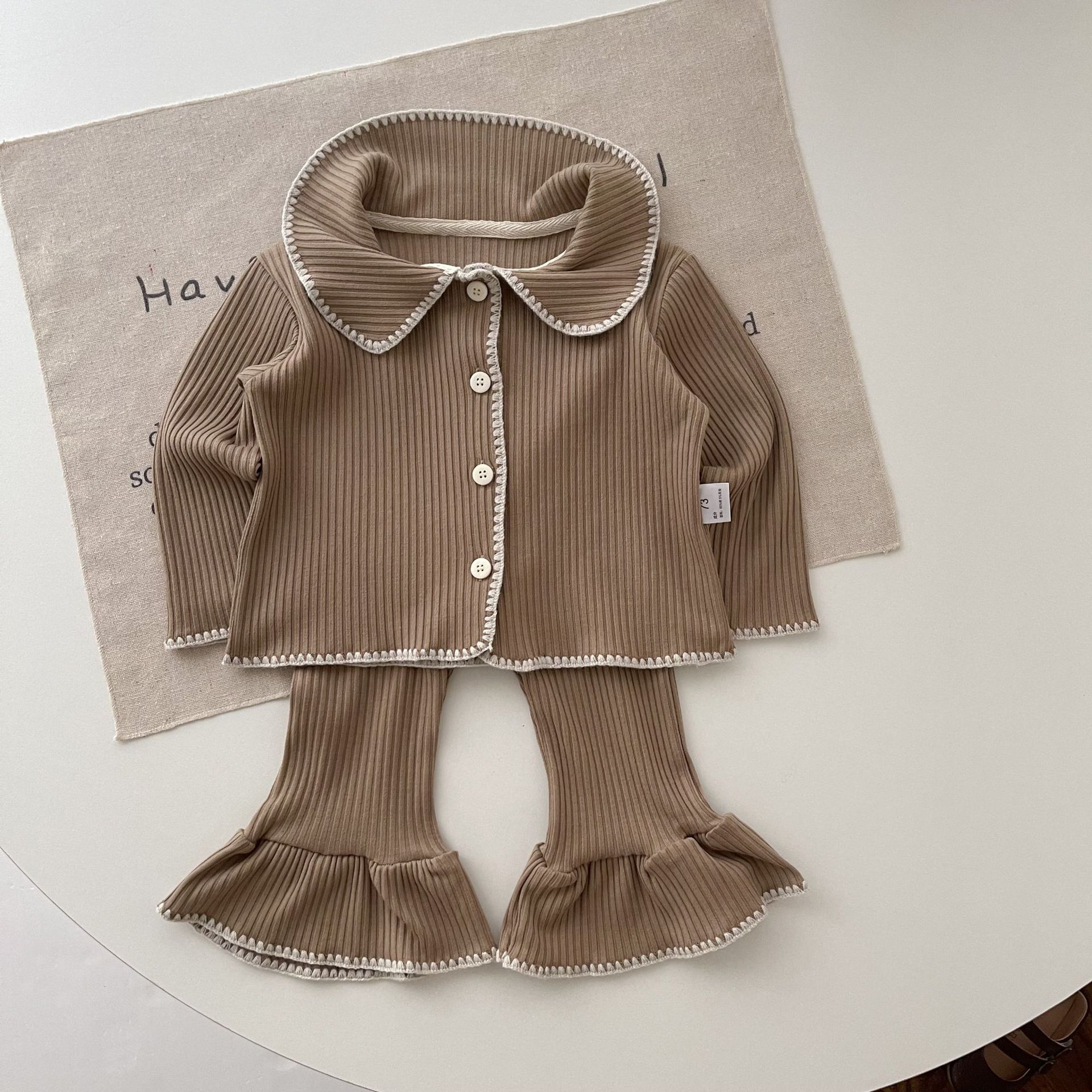 Color: beige small shell long sleeve cardigan flared pants, coffee small shell long sleeve cardigan flared pants