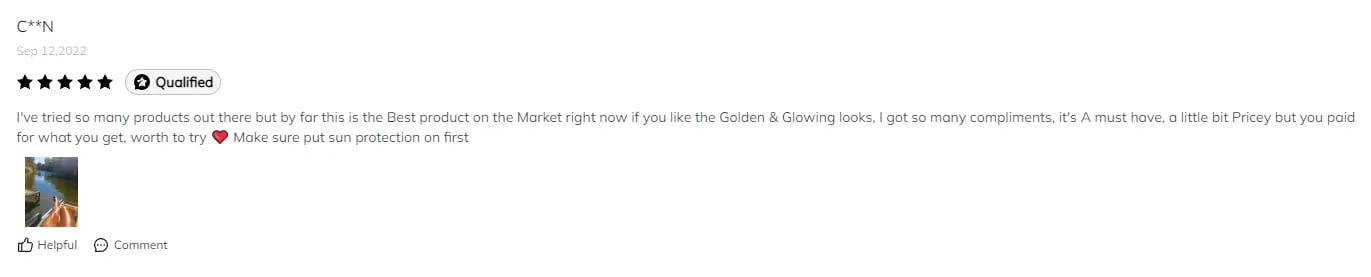 I've tried so many products out there but by far this is the Best product on the Market right now if you like the Golden & Glowing looks, I got so many compliments, it's A must have, a little bit Pricey but you paid for what you get, worth to try â¤ï¸ Make sure put sun protection on first.————— Christine TRAN 2023.9.12