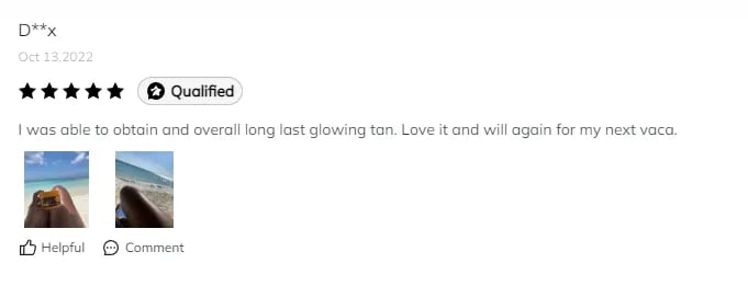 “ I was able to obtain and overall long last glowing tan. Love it and will again for my next vaca.†————— Dana