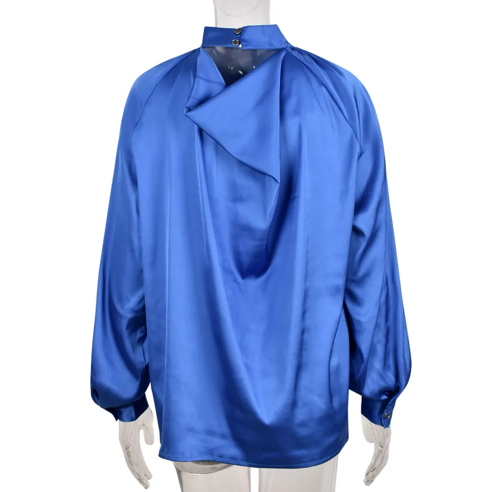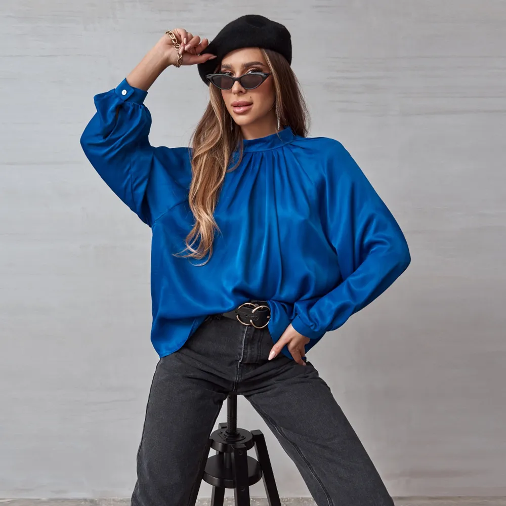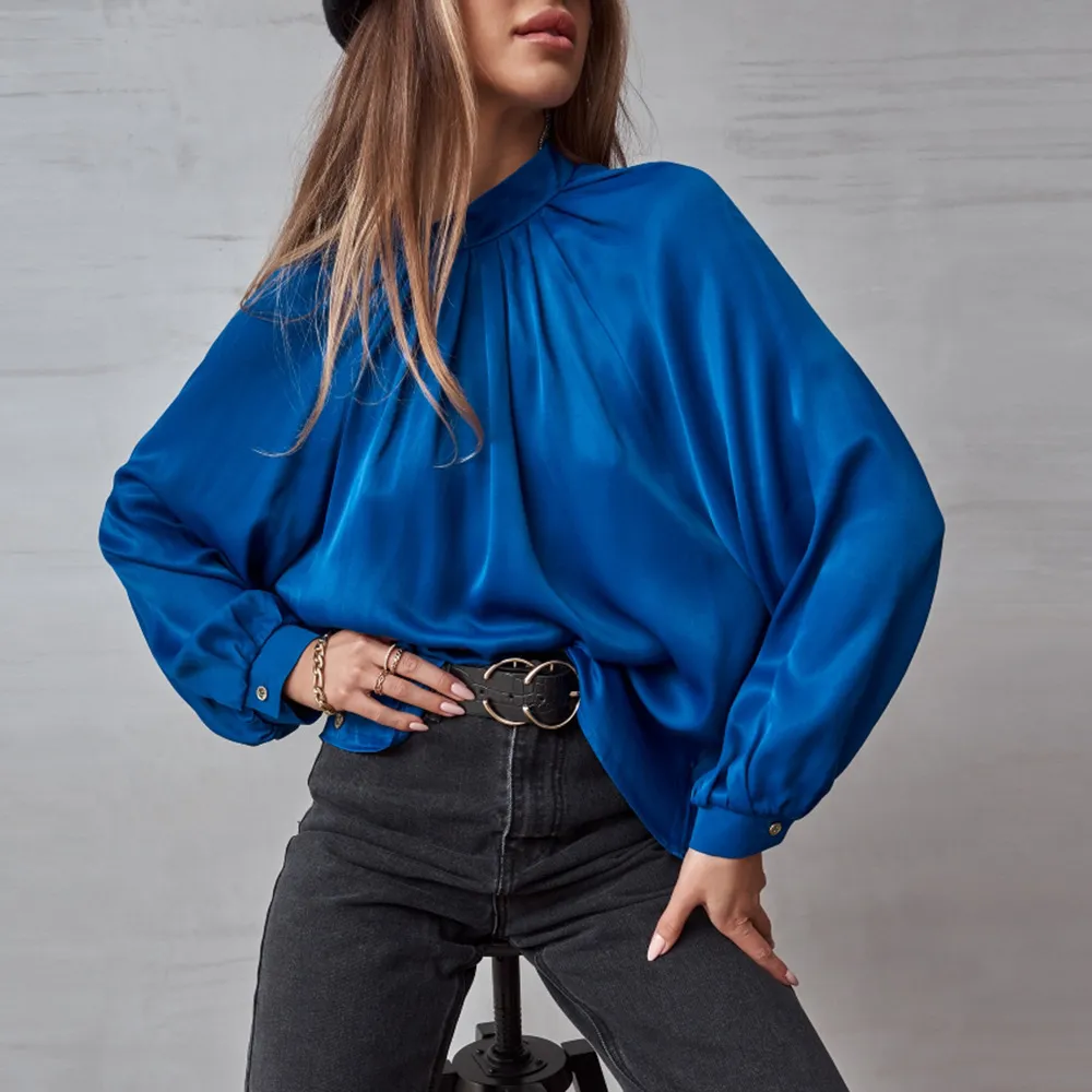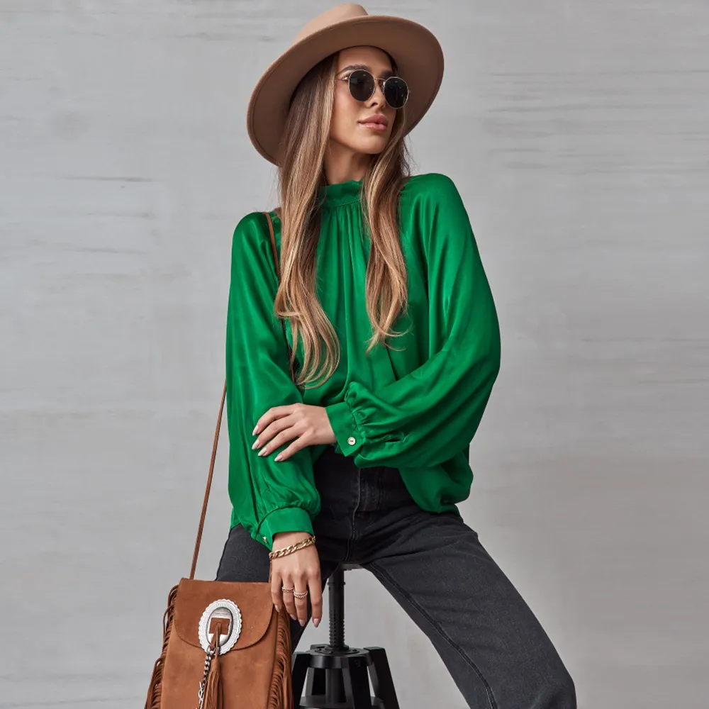 Irregular Stand Collar Stitching Lantern Sleeve Shirt Top