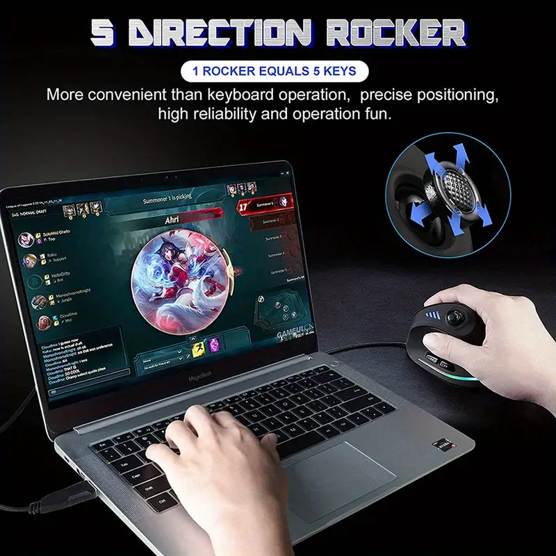 The 5-direction rocker allows gamers to optimize their performance in every campaign. In this gaming mouse, one rocker functions as five buttons. It provides thumb control for operations such as 'forward, backward, left, right, and downward pressure.' This design is suitable for various game genres including FPS, MOBA, and MMO.The programmable buttons enable users to set functions for all 11 buttons based on their personal preferences. Using the provided software (see manual), you can create a customized gaming mouse tailored to your needs. The programmed settings will be stored in the mouse, so when you connect it to a different computer, there's no need to reset anything.This gaming mouse features a high configuration with a sensor that has five levels of adjustable speed ranging from 1500 to 10000. It is equipped with a PMW3325 optical chip, offering a movement speed of 100IPS, an acceleration of 20G, and a scanning frequency of 5000FPS to enhance your gaming experience.The RGB LED light strip features color-changing capabilities on both