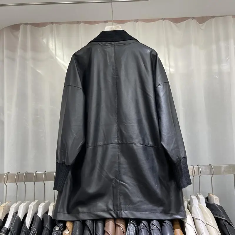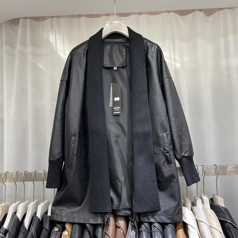 Knitted Stitching Mid-length Leather Coat