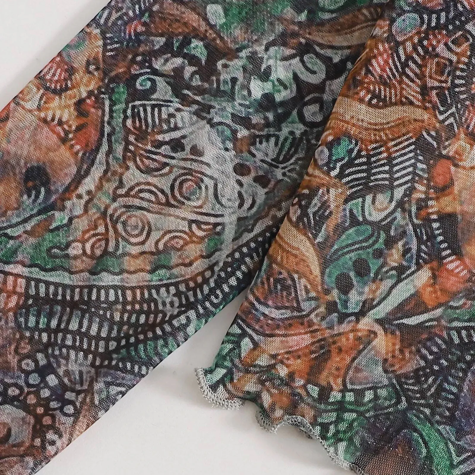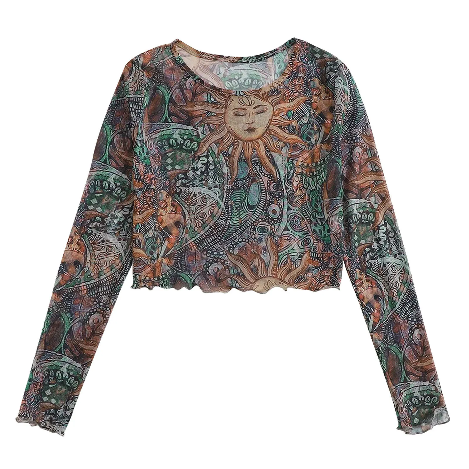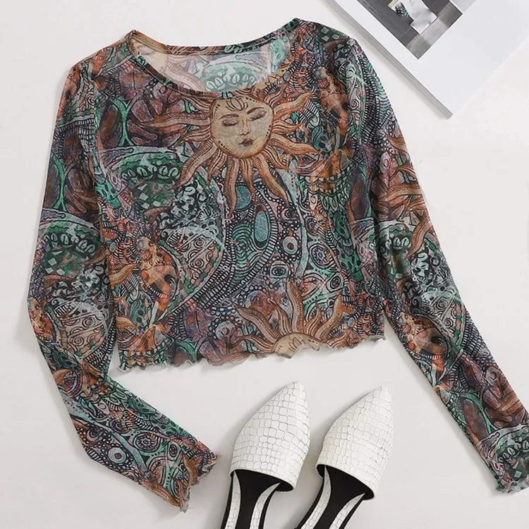 Ladies Round Neck Mesh See-through Sunflower Print Long Sleeves