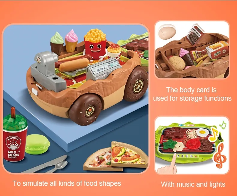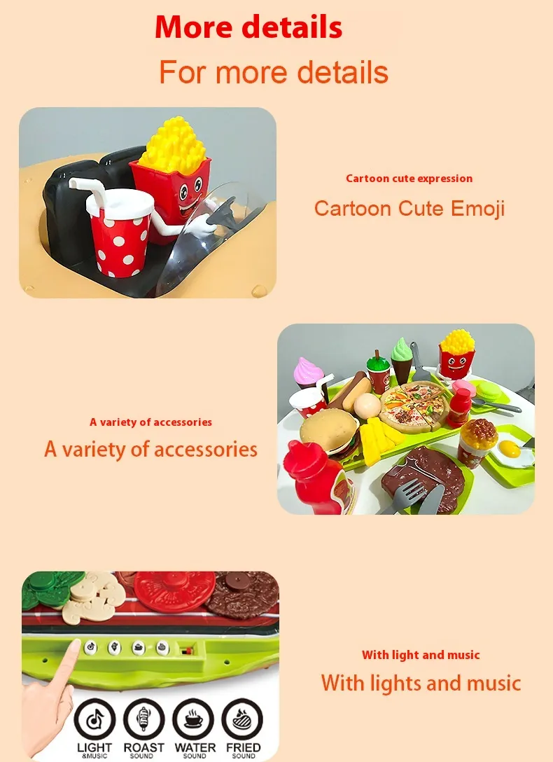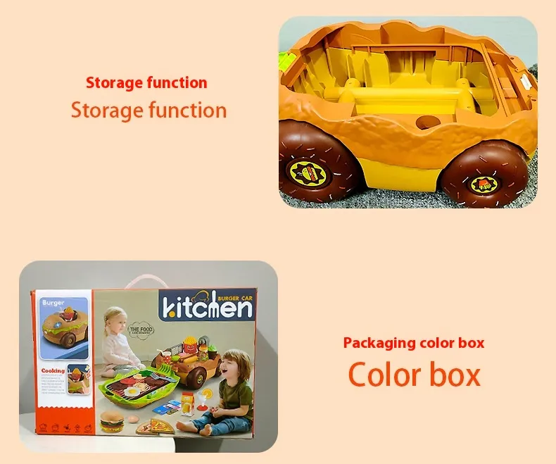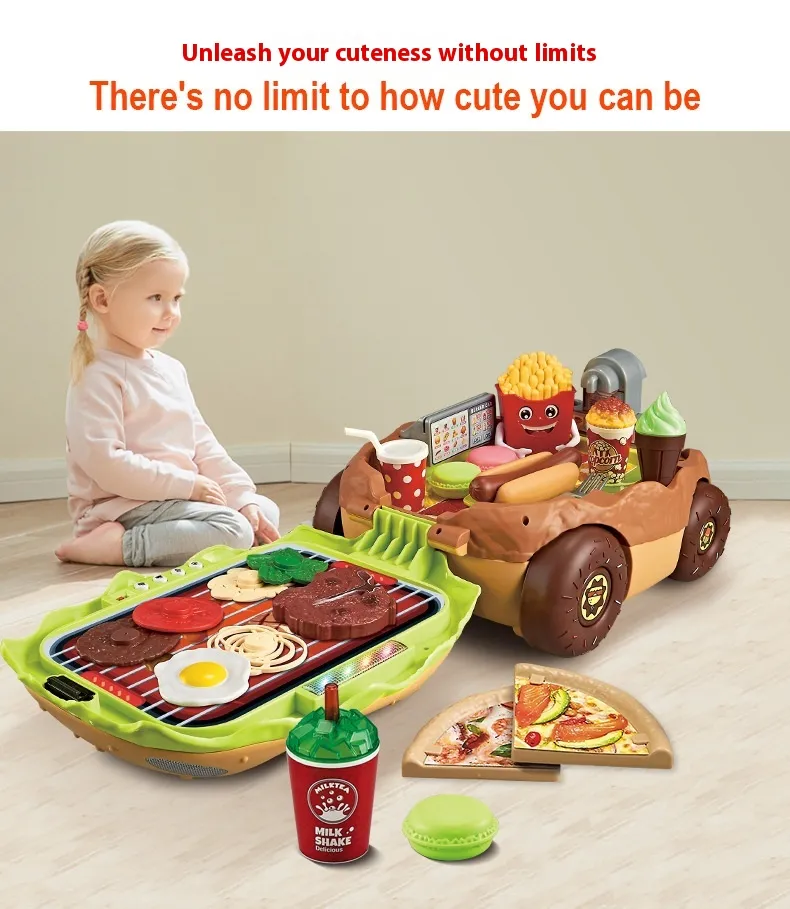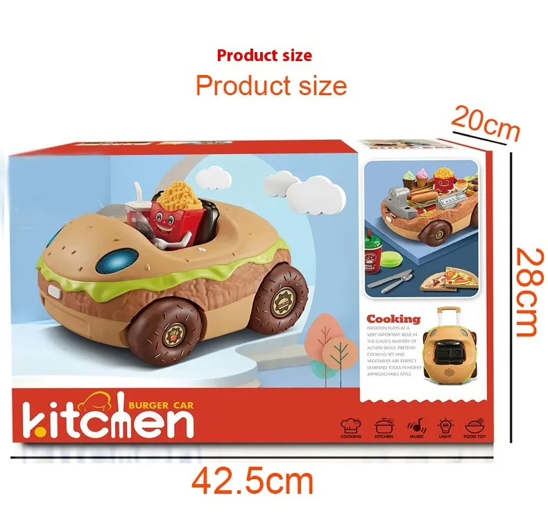 The Large European and American Children Play House Kitchen Toy Hamburger Barbecue Cooking Kitchenware Tableware Sales Pushcart is more than just a toy—it's an interactive, educational experience that fosters creativity, teamwork, and social skills. Whether your child dreams of being a chef, waiter, or restaurant owner, this playset offers endless possibilities for imaginative play. Its realistic features and vibrant design make it the perfect addition to any child's playroom, ensuring hours of fun and learning.