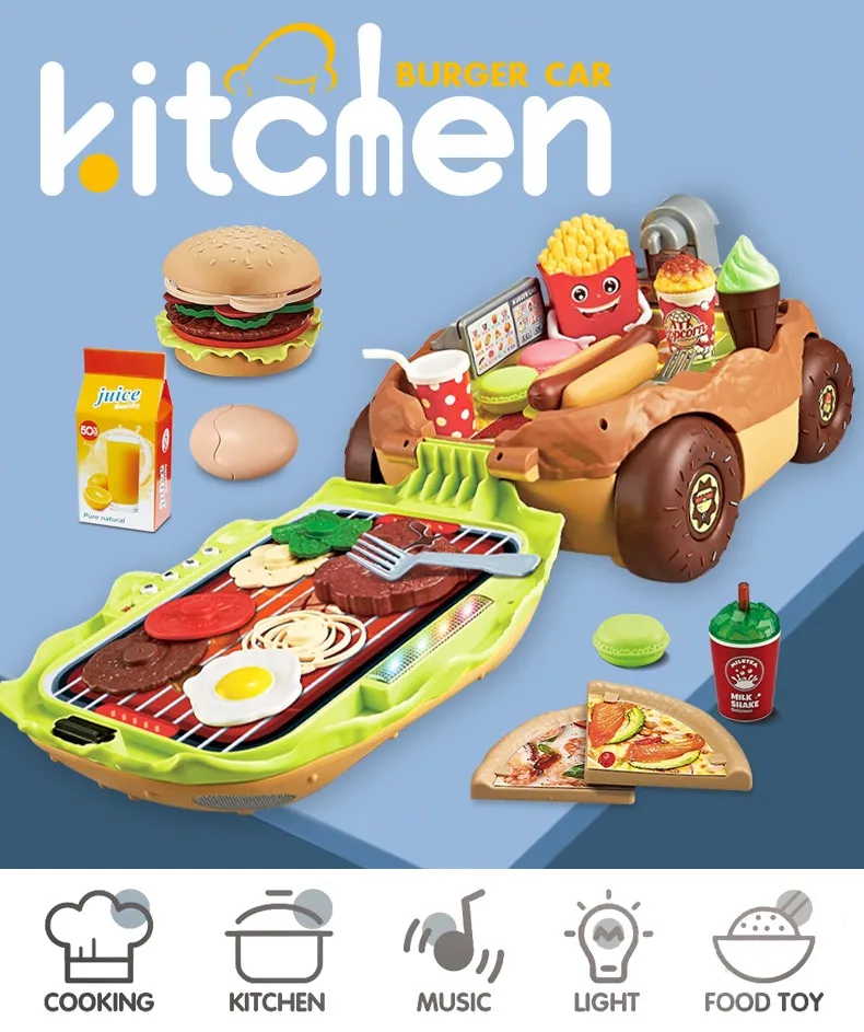 Why Choose the Large European and American Children Play House Kitchen Toy Hamburger Barbecue Cooking Kitchenware Tableware Sales Pushcart?