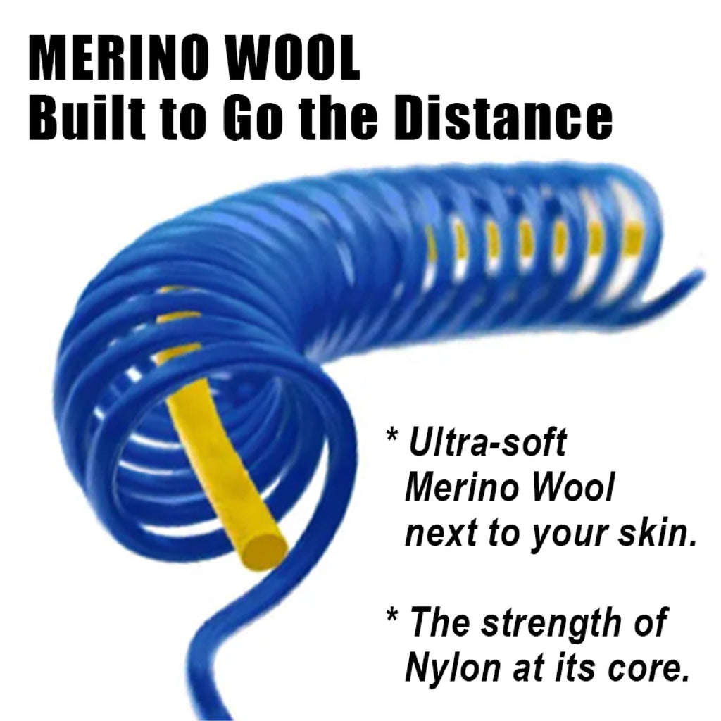 Our superfine Merino Wool completely envelopes a strong Nylon/Spandex core. Melding the durability and toughness of Nylon with the incredible performance features of Merino Wool.