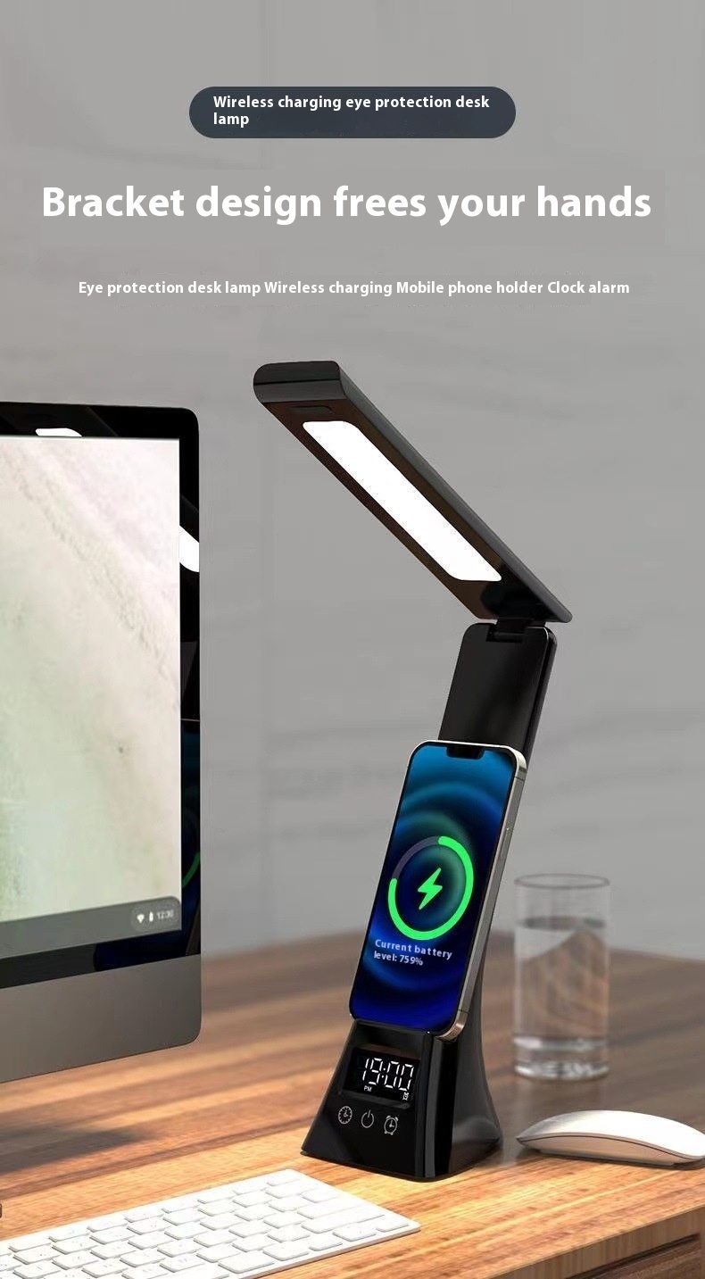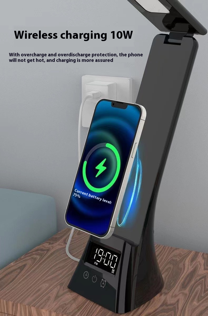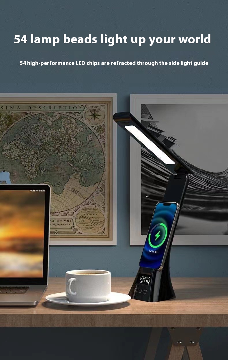 Illuminate your workspace with our LED Smart Desk Lamp featuring a wireless fast charger. This modern and efficient desk lamp provides bright lighting and quick charging for your devices, combining functionality and convenience.