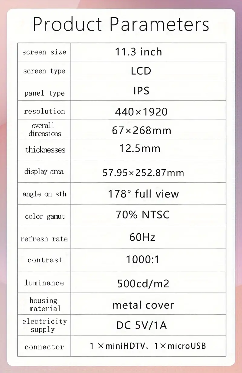 Introducing the LESOWN 28.7cm Ultra-Wide Bar Monitor, designed for those who need an extra screen for enhanced productivity or a more immersive gaming experience. With its 440x1920 HD stretched display, this monitor delivers crystal-clear visuals in a frameless design that offers a sleek, modern look. Whether you're using it to monitor your CPU/GPU temperatures, as a secondary screen for your gaming PC, Raspberry Pi, or laptop, or for other purposes, this monitor meets your needs with style and functionality.