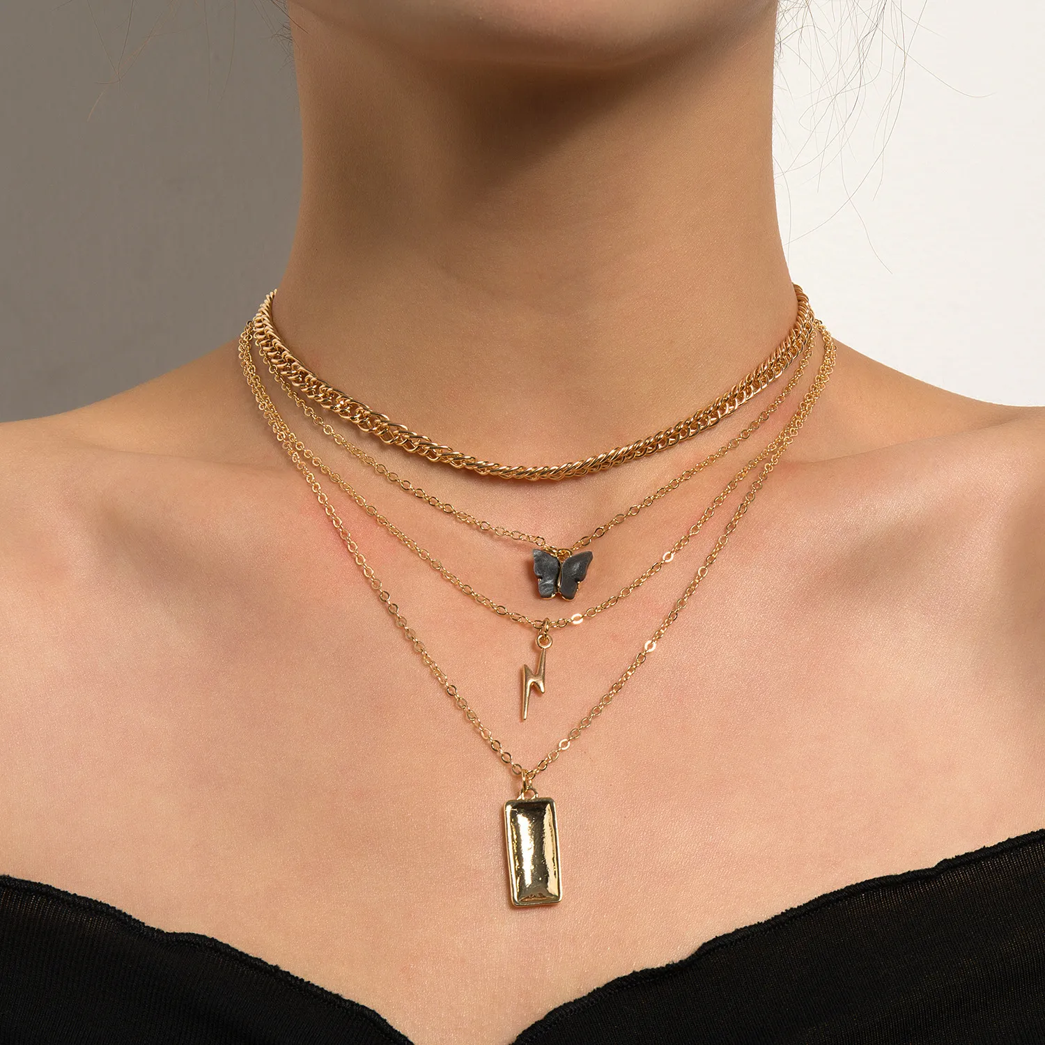 Lightning Butterfly Square Pendant Multilayer Necklace