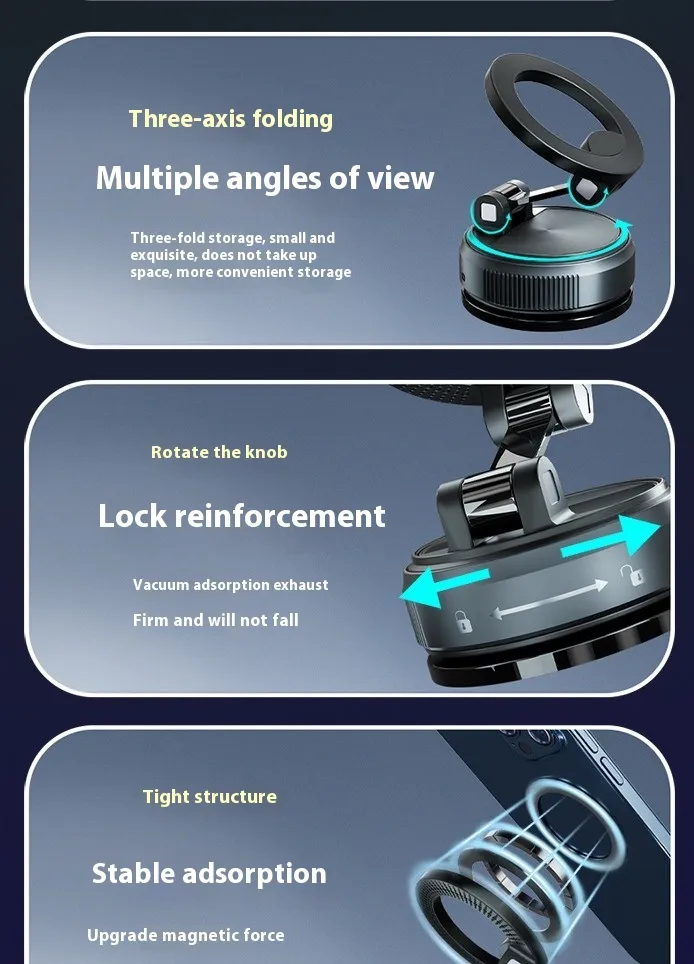 Featuring powerful magnets and a vacuum suction base, this car phone holder provides stable and reliable support on dashboards or windshields. The 360° rotation allows you to adjust your phone to the perfect viewing angle for navigation or video calls.