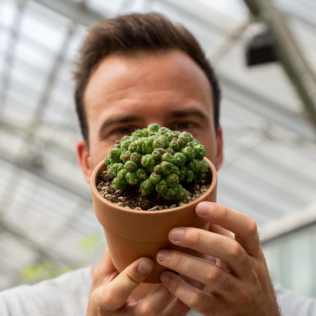 Mammillaria bocasana 'Fred' is known for its unusual and eye-catching morphology. This plant features a cylindrical base cactus that supports a dense cluster of small, globular offsets. These offsets form a fascinating, coral-like head that is tightly packed with numerous small, green tubercles. Each tubercle is adorned with short, white spines and, at times, tiny reddish-brown tips, adding to the plant's unique aesthetic.