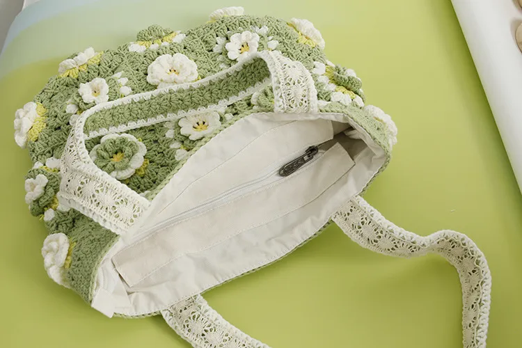 Despite its delicate appearance, the Matcha Laminate Wool Crocheted Bag offers ample space for your everyday essentials. Its roomy interior is perfect for keeping your belongings organized and within easy reach.