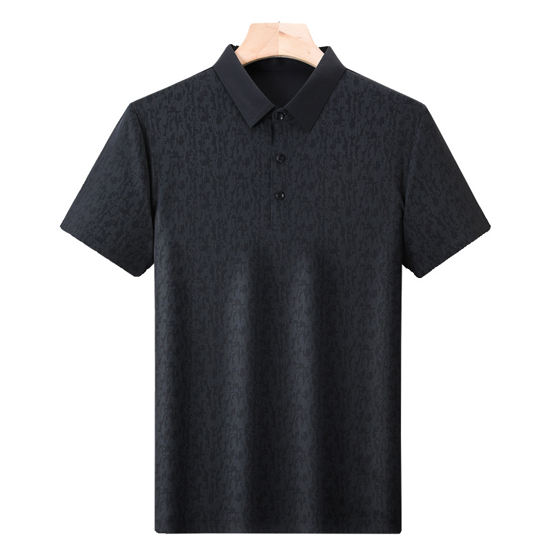 fabric, it ensures you stay cool and comfortable throughout the day. Featuring a subtle, monochromatic pattern and a classic collar with a three-button placket, this tee is perfect for both office settings and social gatherings. Its versatile design allows for effortless pairing